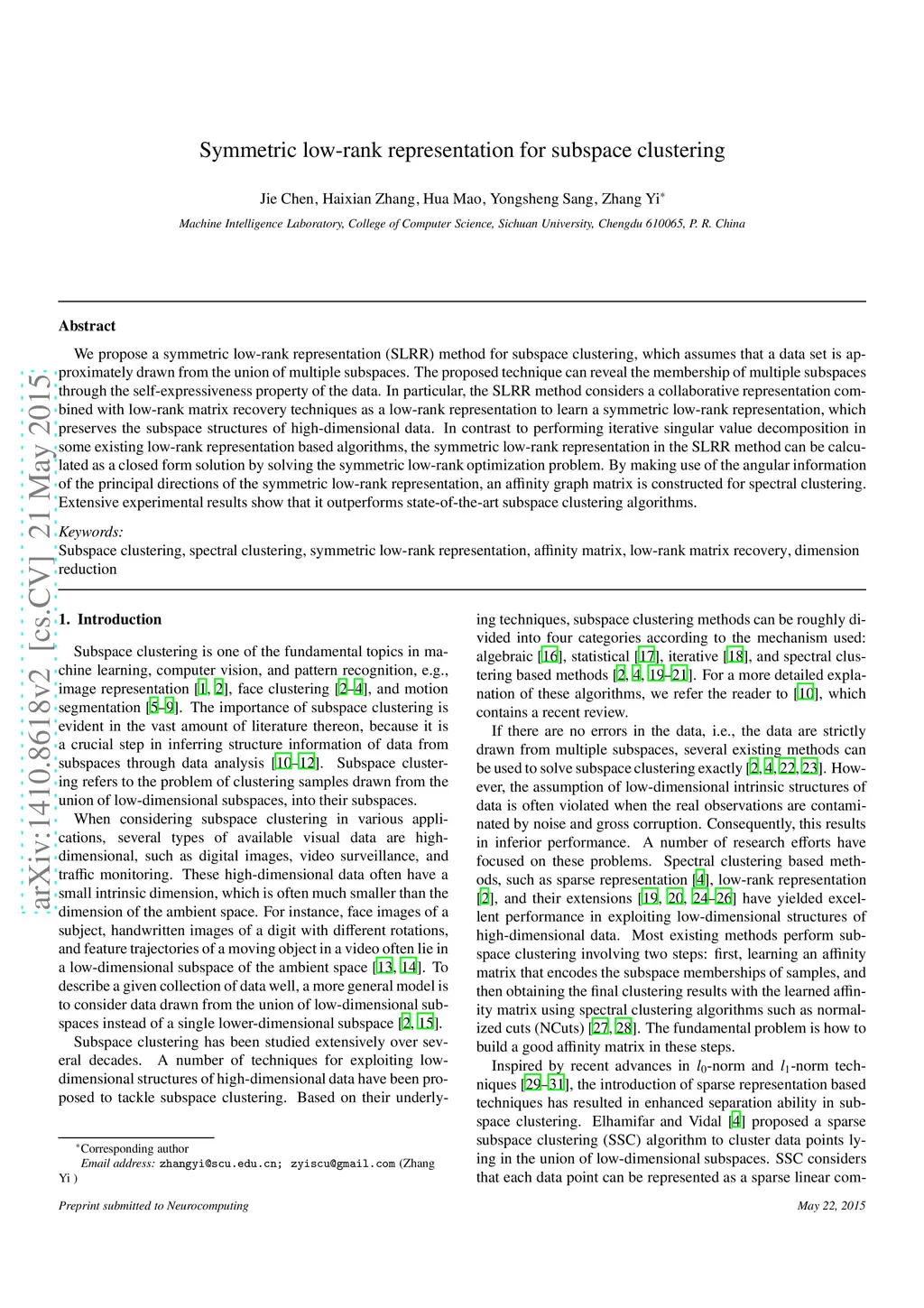 Symmetric low-rank representation for subspace clustering