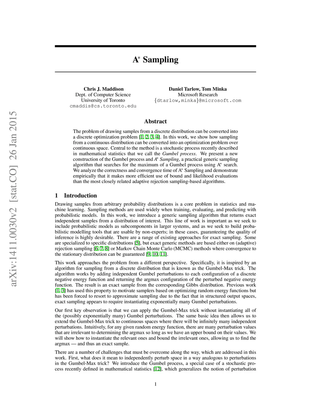 The problem of drawing samples from a discrete distribution can be converted into a discrete optimization problem. In this work, we show how sampling from a continuous distribution can be converted into an optimization problem over continuous space. Central to the method is a stochastic process recently described in mathematical statistics that we call the Gumbel process. We present a new construction of the Gumbel process and A* sampling, a practical generic sampling algorithm that searches for the maximum of a Gumbel process using A* search. We analyze the correctness and convergence time of A* sampling and demonstrate empirically that it makes more efficient use of bound and likelihood evaluations than the most closely related adaptive rejection sampling-based algorithms.