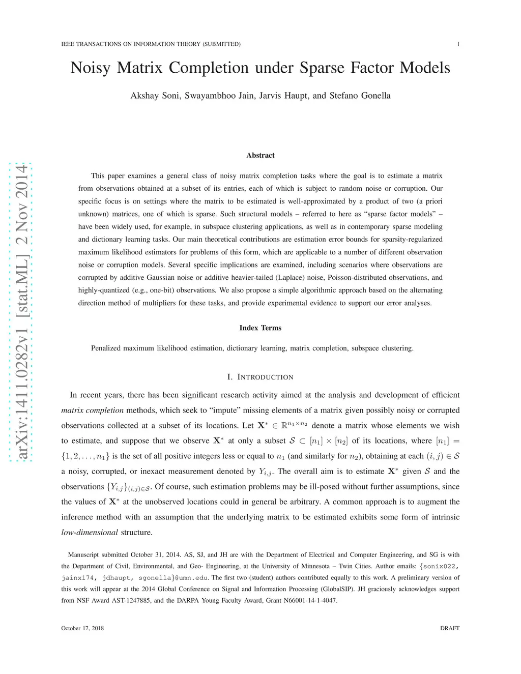 This paper examines a general class of noisy matrix completion tasks where the goal is to estimate a matrix from observations obtained at a subset of its entries, each of which is subject to random noise or corruption. Our specific focus is on settings where the matrix to be estimated is well-approximated by a product of two (a priori unknown) matrices, one of which is sparse. Such structural models - referred to here as "sparse factor models" - have been widely used, for example, in subspace clustering applications, as well as in contemporary sparse modeling and dictionary learning tasks. Our main theoretical contributions are estimation error bounds for sparsity-regularized maximum likelihood estimators for problems of this form, which are applicable to a number of different observation noise or corruption models. Several specific implications are examined, including scenarios where observations are corrupted by additive Gaussian noise or additive heavier-tailed (Laplace) noise, Poisson-distributed observations, and highly-quantized (e.g., one-bit) observations. We also propose a simple algorithmic approach based on the alternating direction method of multipliers for these tasks, and provide experimental evidence to support our error analyses.