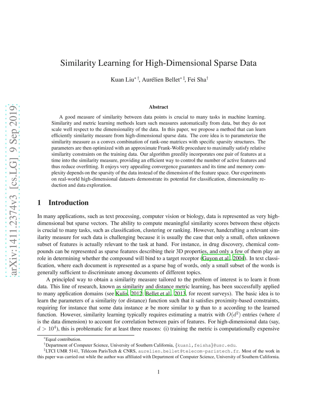 A good measure of similarity between data points is crucial to many tasks in machine learning. Similarity and metric learning methods learn such measures automatically from data, but they do not scale well respect to the dimensionality of the data. In this paper, we propose a method that can learn efficiently similarity measure from high-dimensional sparse data. The core idea is to parameterize the similarity measure as a convex combination of rank-one matrices with specific sparsity structures. The parameters are then optimized with an approximate Frank-Wolfe procedure to maximally satisfy relative similarity constraints on the training data. Our algorithm greedily incorporates one pair of features at a time into the similarity measure, providing an efficient way to control the number of active features and thus reduce overfitting. It enjoys very appealing convergence guarantees and its time and memory complexity depends on the sparsity of the data instead of the dimension of the feature space. Our experiments on real-world high-dimensional datasets demonstrate its potential for classification, dimensionality reduction and data exploration.