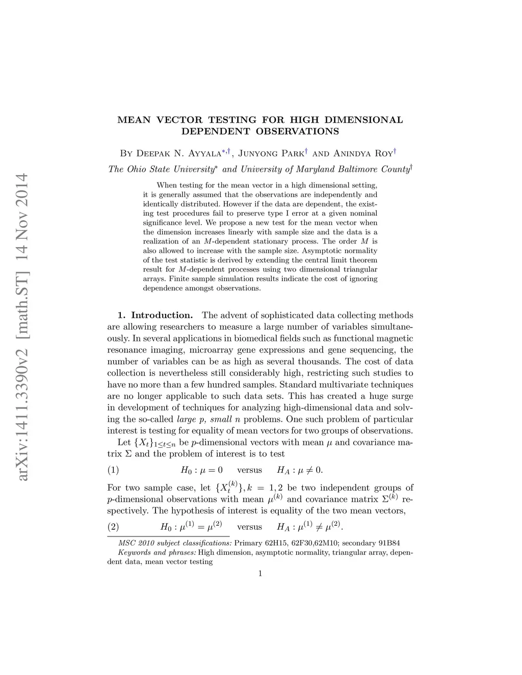 When testing for the mean vector in a high dimensional setting, it is generally assumed that the observations are independently and identically distributed. However if the data are dependent, the existing test procedures fail to preserve type I error at a given nominal significance level. We propose a new test for the mean vector when the dimension increases linearly with sample size and the data is a realization of an M -dependent stationary process. The order M is also allowed to increase with the sample size. Asymptotic normality of the test statistic is derived by extending the central limit theorem result for M -dependent processes using two dimensional triangular arrays. Finite sample simulation results indicate the cost of ignoring dependence amongst observations.