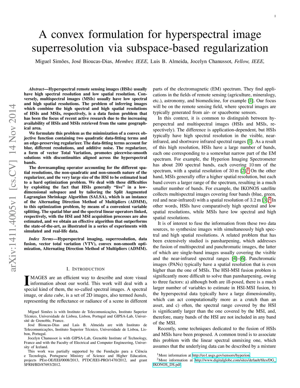 Hyperspectral remote sensing images (HSIs) usually have high spectral resolution and low spatial resolution. Conversely, multispectral images (MSIs) usually have low spectral and high spatial resolutions. The problem of inferring images which combine the high spectral and high spatial resolutions of HSIs and MSIs, respectively, is a data fusion problem that has been the focus of recent active research due to the increasing availability of HSIs and MSIs retrieved from the same geographical area. We formulate this problem as the minimization of a convex objective function containing two quadratic data-fitting terms and an edge-preserving regularizer. The data-fitting terms account for blur, different resolutions, and additive noise. The regularizer, a form of vector Total Variation, promotes piecewise-smooth solutions with discontinuities aligned across the hyperspectral bands. The downsampling operator accounting for the different spatial resolutions, the non-quadratic and non-smooth nature of the regularizer, and the very large size of the HSI to be estimated lead to a hard optimization problem. We deal with these difficulties by exploiting the fact that HSIs generally "live" in a low-dimensional subspace and by tailoring the Split Augmented Lagrangian Shrinkage Algorithm (SALSA), which is an instance of the Alternating Direction Method of Multipliers (ADMM), to this optimization problem, by means of a convenient variable splitting. The spatial blur and the spectral linear operators linked, respectively, with the HSI and MSI acquisition processes are also estimated, and we obtain an effective algorithm that outperforms the state-of-the-art, as illustrated in a series of experiments with simulated and real-life data.