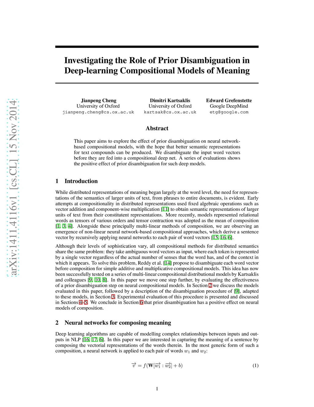This paper aims to explore the effect of prior disambiguation on neural network- based compositional models, with the hope that better semantic representations for text compounds can be produced. We disambiguate the input word vectors before they are fed into a compositional deep net. A series of evaluations shows the positive effect of prior disambiguation for such deep models.