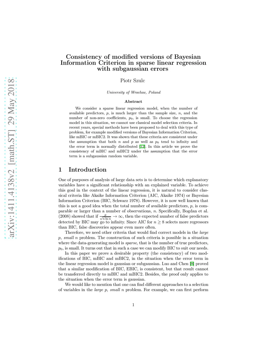 We consider a sparse linear regression model, when the number of available predictors, , is much larger than the sample size, , and the number of non-zero coefficients, , is small. To choose the regression model in this situation, we cannot use classical model selection criteria. In recent years, special methods have been proposed to deal with this type of problem, for example modified versions of Bayesian Information Criterion, like mBIC or mBIC2. It was shown that these criteria are consistent under the assumption that both and as well as tend to infinity and the error term is normally distributed. In this article we prove the consistency of mBIC and mBIC2 under the assumption that the error term is a subgaussian random variable.