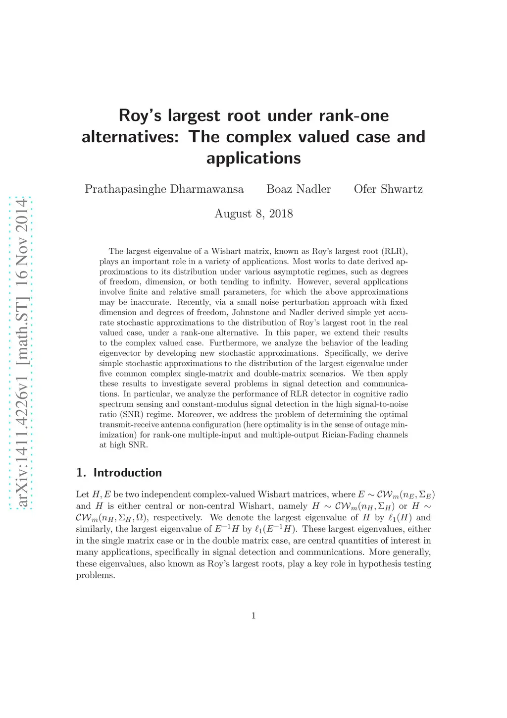 The largest eigenvalue of a Wishart matrix, known as Roy's largest root (RLR), plays an important role in a variety of applications. Most works to date derived approximations to its distribution under various asymptotic regimes, such as degrees of freedom, dimension, or both tending to infinity. However, several applications involve finite and relative small parameters, for which the above approximations may be inaccurate. Recently, via a small noise perturbation approach with fixed dimension and degrees of freedom, Johnstone and Nadler derived simple yet accurate stochastic approximations to the distribution of Roy's largest root in the real valued case, under a rank-one alternative. In this paper, we extend their results to the complex valued case. Furthermore, we analyze the behavior of the leading eigenvector by developing new stochastic approximations. Specifically, we derive simple stochastic approximations to the distribution of the largest eigenvalue under five common complex single-matrix and double-matrix scenarios. We then apply these results to investigate several problems in signal detection and communications. In particular, we analyze the performance of RLR detector in cognitive radio spectrum sensing and constant modulus signal detection in the high signal-to-noise ratio (SNR) regime. Moreover, we address the problem of determining the optimal transmit-receive antenna configuration (here optimality is in the sense of outage minimization) for rank-one multiple-input multiple-output Rician Fading channels at high SNR.