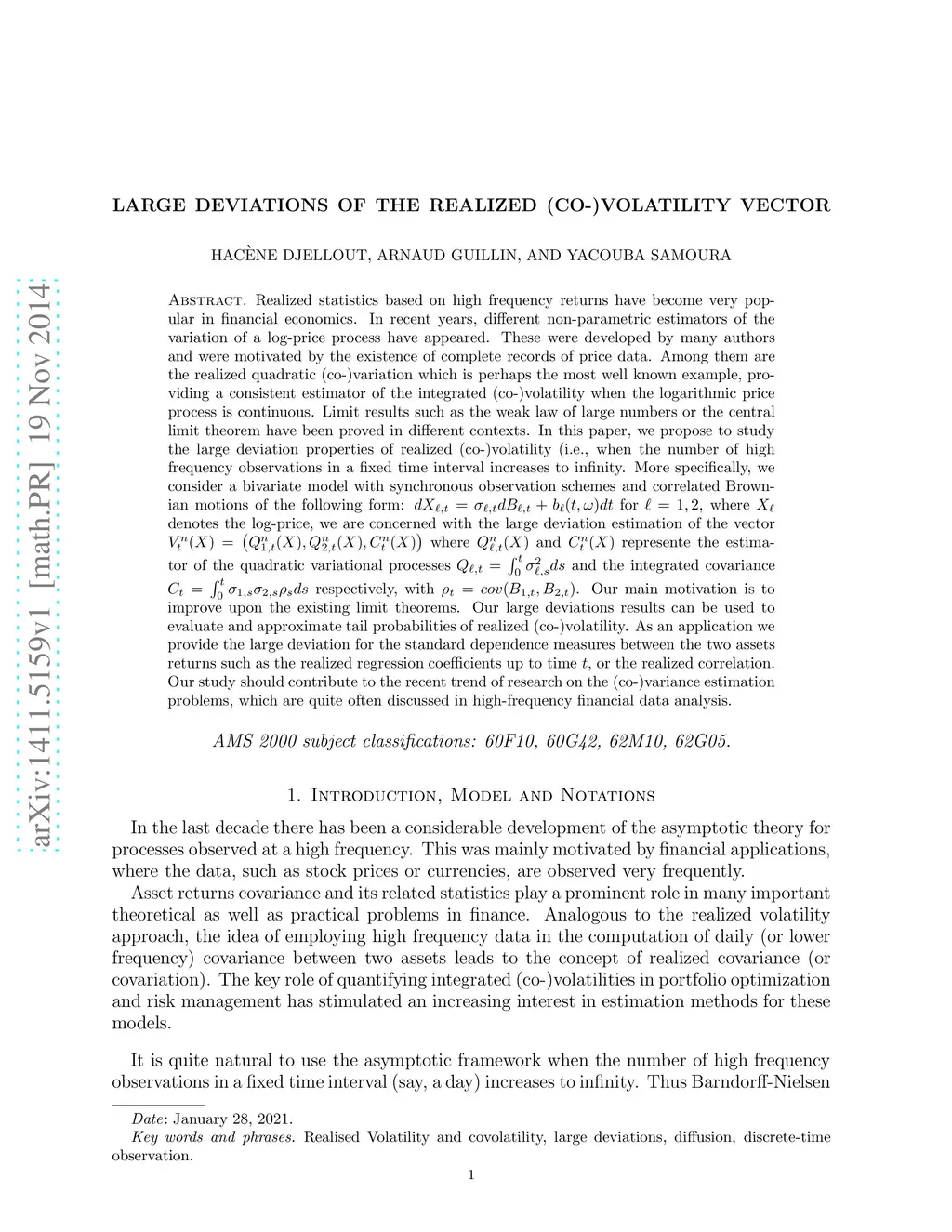 Realized statistics based on high frequency returns have become very popular in financial economics. In recent years, different non-parametric estimators of the variation of a log-price process have appeared. These were developed by many authors and were motivated by the existence of complete records of price data. Among them are the realized quadratic (co-)variation which is perhaps the most well known example, providing a consistent estimator of the integrated (co-)volatility when the logarithmic price process is continuous. Limit results such as the weak law of large numbers or the central limit theorem have been proved in different contexts. In this paper, we propose to study the large deviation properties of realized (co-)volatility (i.e., when the number of high frequency observations in a fixed time interval increases to infinity. More specifically, we consider a bivariate model with synchronous observation schemes and correlated Brownian motions of the following form: for , where denotes the log-price, we are concerned with the large deviation estimation of the vector where and represente the estimator of the quadratic variational processes and the integrated covariance respectively, with . Our main motivation is to improve upon the existing limit theorems. Our large deviations results can be used to evaluate and approximate tail probabilities of realized (co-)volatility. As an application we provide the large deviation for the standard dependence measures between the two assets returns such as the realized regression coefficients up to time , or the realized correlation. Our study should contribute to the recent trend of research on the (co-)variance estimation problems, which are quite often discussed in high-frequency financial data analysis.