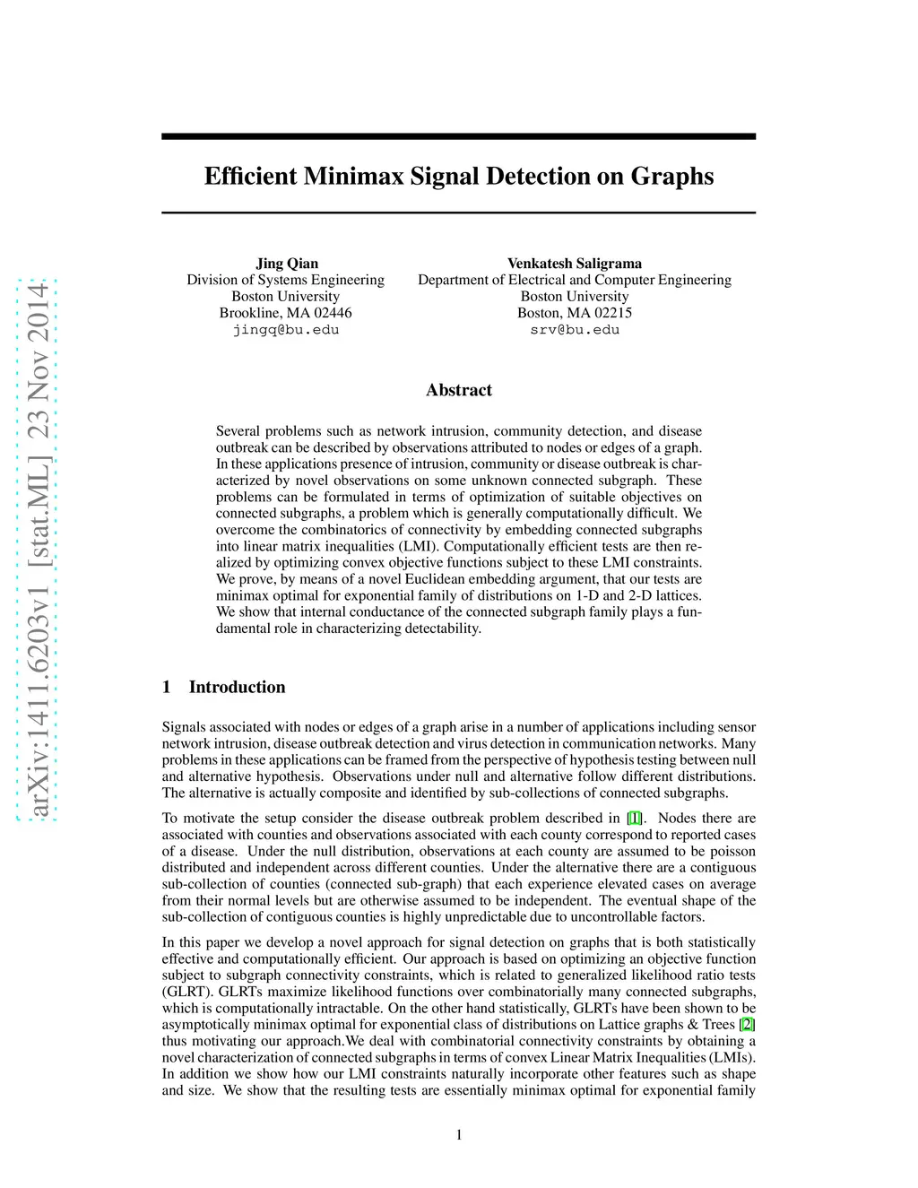 Several problems such as network intrusion, community detection, and disease outbreak can be described by observations attributed to nodes or edges of a graph. In these applications presence of intrusion, community or disease outbreak is characterized by novel observations on some unknown connected subgraph. These problems can be formulated in terms of optimization of suitable objectives on connected subgraphs, a problem which is generally computationally difficult. We overcome the combinatorics of connectivity by embedding connected subgraphs into linear matrix inequalities (LMI). Computationally efficient tests are then realized by optimizing convex objective functions subject to these LMI constraints. We prove, by means of a novel Euclidean embedding argument, that our tests are minimax optimal for exponential family of distributions on 1-D and 2-D lattices. We show that internal conductance of the connected subgraph family plays a fundamental role in characterizing detectability.