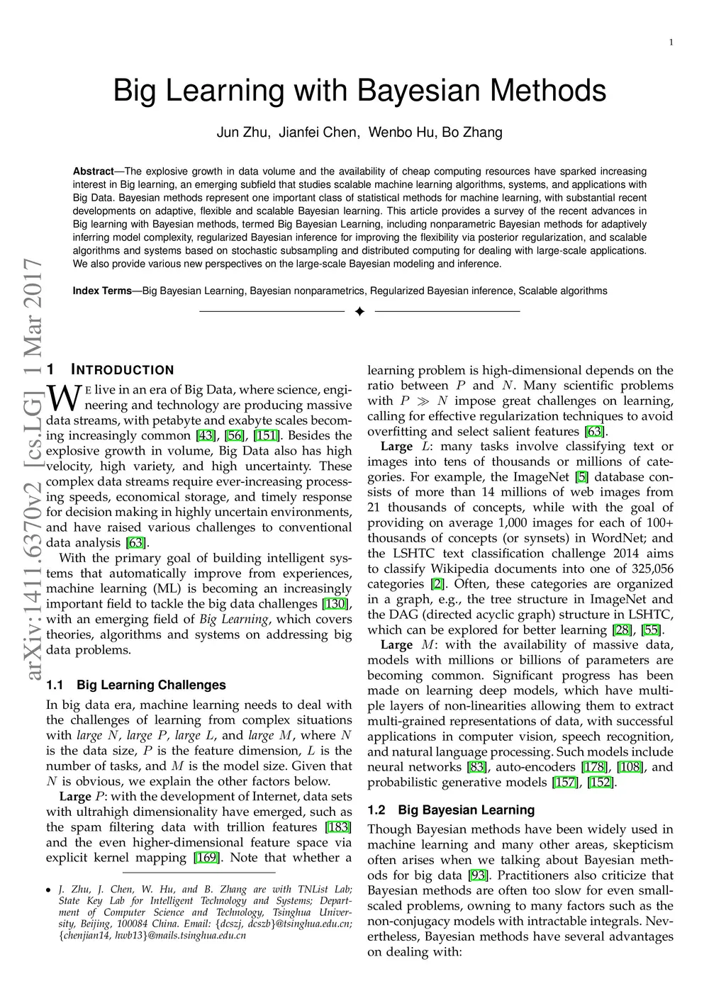 Explosive growth in data and availability of cheap computing resources have sparked increasing interest in Big learning, an emerging subfield that studies scalable machine learning algorithms, systems, and applications with Big Data. Bayesian methods represent one important class of statistic methods for machine learning, with substantial recent developments on adaptive, flexible and scalable Bayesian learning. This article provides a survey of the recent advances in Big learning with Bayesian methods, termed Big Bayesian Learning, including nonparametric Bayesian methods for adaptively inferring model complexity, regularized Bayesian inference for improving the flexibility via posterior regularization, and scalable algorithms and systems based on stochastic subsampling and distributed computing for dealing with large-scale applications.