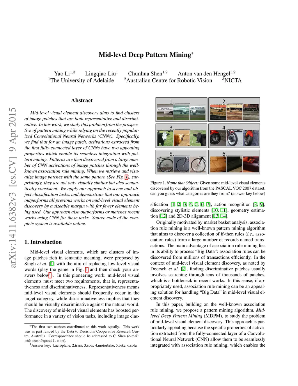 Mid-level visual element discovery aims to find clusters of image patches that are both representative and discriminative. In this work, we study this problem from the prospective of pattern mining while relying on the recently popularized Convolutional Neural Networks (CNNs). Specifically, we find that for an image patch, activations extracted from the first fully-connected layer of CNNs have two appealing properties which enable its seamless integration with pattern mining. Patterns are then discovered from a large number of CNN activations of image patches through the well-known association rule mining. When we retrieve and visualize image patches with the same pattern, surprisingly, they are not only visually similar but also semantically consistent. We apply our approach to scene and object classification tasks, and demonstrate that our approach outperforms all previous works on mid-level visual element discovery by a sizeable margin with far fewer elements being used. Our approach also outperforms or matches recent works using CNN for these tasks. Source code of the complete system is available online.