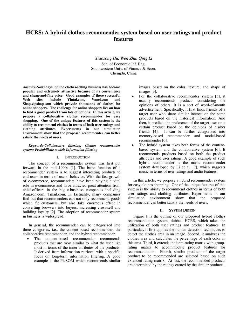 HCRS: A hybrid clothes recommender system based on user ratings and