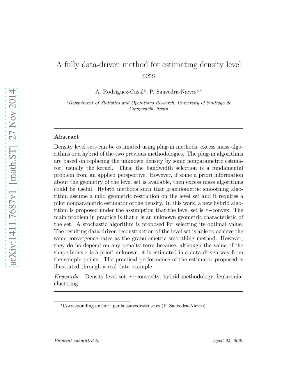 Density level sets can be estimated using plug-in methods, excess mass algorithms or a hybrid of the two previous methodologies. The plug-in algorithms are based on replacing the unknown density by some nonparametric estimator, usually the kernel. Thus, the bandwidth selection is a fundamental problem from an applied perspective. However, if some a priori information about the geometry of the level set is available, then excess mass algorithms could be useful. Hybrid methods such that granulometric smoothing algorithm assume a mild geometric restriction on the level set and it requires a pilot nonparametric estimator of the density. In this work, a new hybrid algorithm is proposed under the assumption that the level set is r-convex. The main problem in practice is that r is an unknown geometric characteristic of the set. A stochastic algorithm is proposed for selecting its optimal value. The resulting data-driven reconstruction of the level set is able to achieve the same convergence rates as the granulometric smoothing method. However, they do no depend on any penalty term because, although the value of the shape index r is a priori unknown, it is estimated in a data-driven way from the sample points. The practical performance of the estimator proposed is illustrated through a real data example.