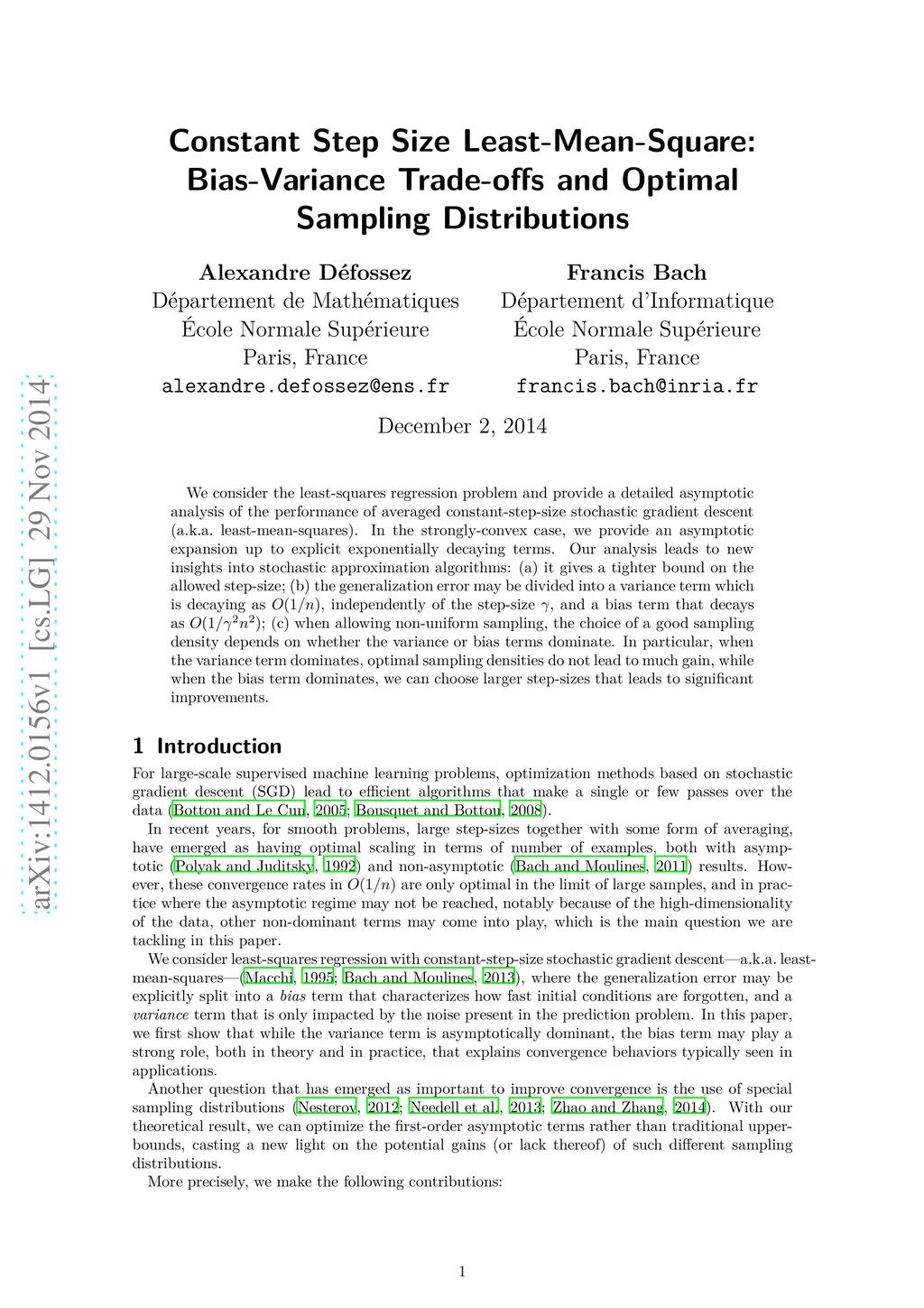 We consider the least-squares regression problem and provide a detailed asymptotic analysis of the performance of averaged constant-step-size stochastic gradient descent (a.k.a. least-mean-squares). In the strongly-convex case, we provide an asymptotic expansion up to explicit exponentially decaying terms. Our analysis leads to new insights into stochastic approximation algorithms: (a) it gives a tighter bound on the allowed step-size; (b) the generalization error may be divided into a variance term which is decaying as O(1/n), independently of the step-size , and a bias term that decays as O(1/ 2 n 2); (c) when allowing non-uniform sampling, the choice of a good sampling density depends on whether the variance or bias terms dominate. In particular, when the variance term dominates, optimal sampling densities do not lead to much gain, while when the bias term dominates, we can choose larger step-sizes that leads to significant improvements.