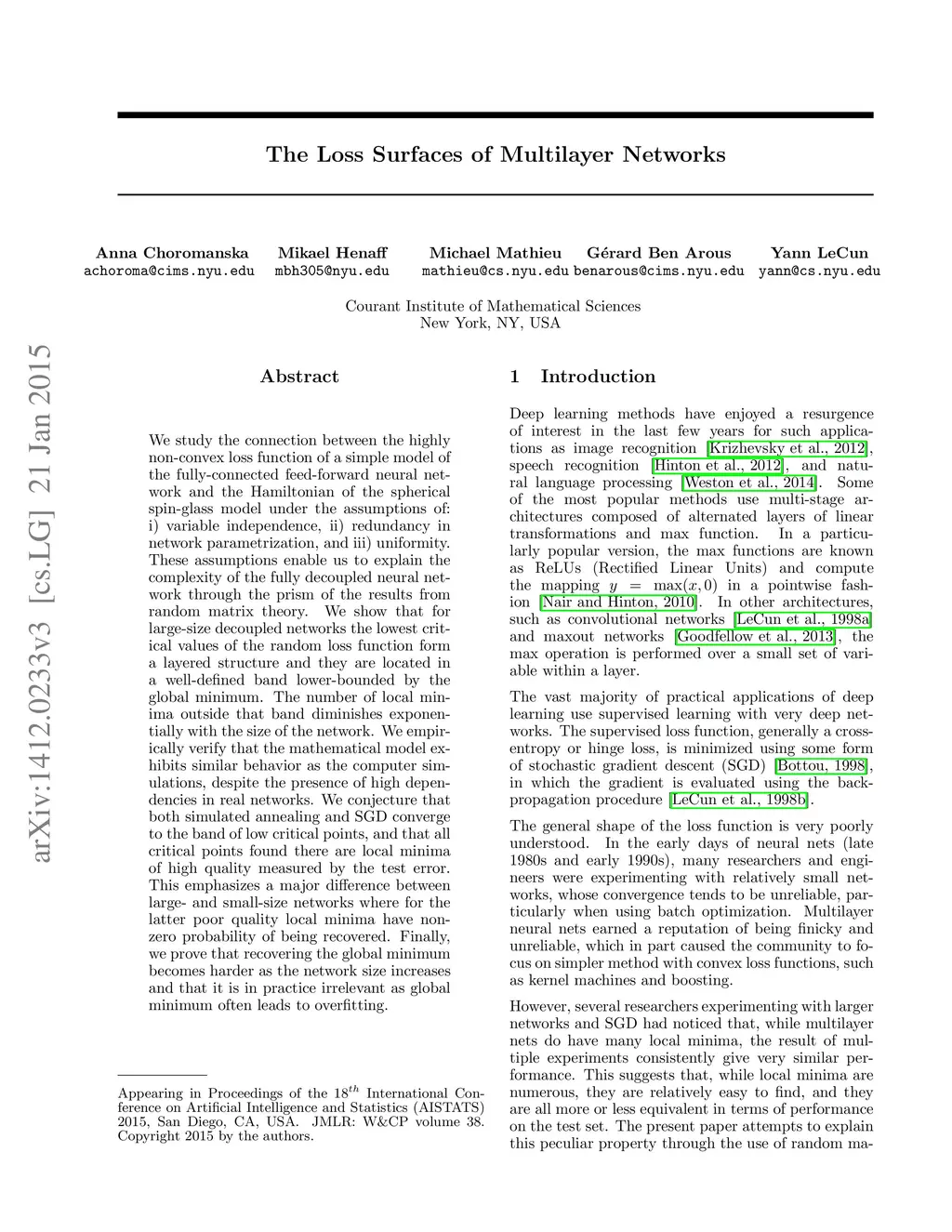 We study the connection between the highly non-convex loss function of a simple model of the fully-connected feed-forward neural network and the Hamiltonian of the spherical spin-glass model under the assumptions of: i) variable independence, ii) redundancy in network parametrization, and iii) uniformity. These assumptions enable us to explain the complexity of the fully decoupled neural network through the prism of the results from random matrix theory. We show that for large-size decoupled networks the lowest critical values of the random loss function form a layered structure and they are located in a well-defined band lower-bounded by the global minimum. The number of local minima outside that band diminishes exponentially with the size of the network. We empirically verify that the mathematical model exhibits similar behavior as the computer simulations, despite the presence of high dependencies in real networks. We conjecture that both simulated annealing and SGD converge to the band of low critical points, and that all critical points found there are local minima of high quality measured by the test error. This emphasizes a major difference between large- and small-size networks where for the latter poor quality local minima have non-zero probability of being recovered. Finally, we prove that recovering the global minimum becomes harder as the network size increases and that it is in practice irrelevant as global minimum often leads to overfitting.
