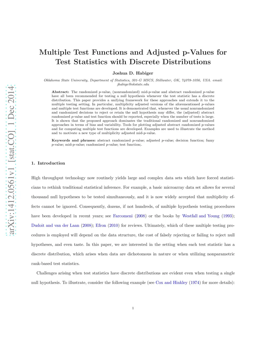 The randomized -value, (nonrandomized) mid--value and abstract randomized -value have all been recommended for testing a null hypothesis whenever the test statistic has a discrete distribution. This paper provides a unifying framework for these approaches and extends it to the multiple testing setting. In particular, multiplicity adjusted versions of the aforementioned -values and multiple test functions are developed. It is demonstrated that, whenever the usual nonrandomized and randomized decisions to reject or retain the null hypothesis may differ, the (adjusted) abstract randomized -value and test function should be reported, especially when the number of tests is large. It is shown that the proposed approach dominates the traditional randomized and nonrandomized approaches in terms of bias and variability. Tools for plotting adjusted abstract randomized -values and for computing multiple test functions are developed. Examples are used to illustrate the method and to motivate a new type of multiplicity adjusted mid--value.