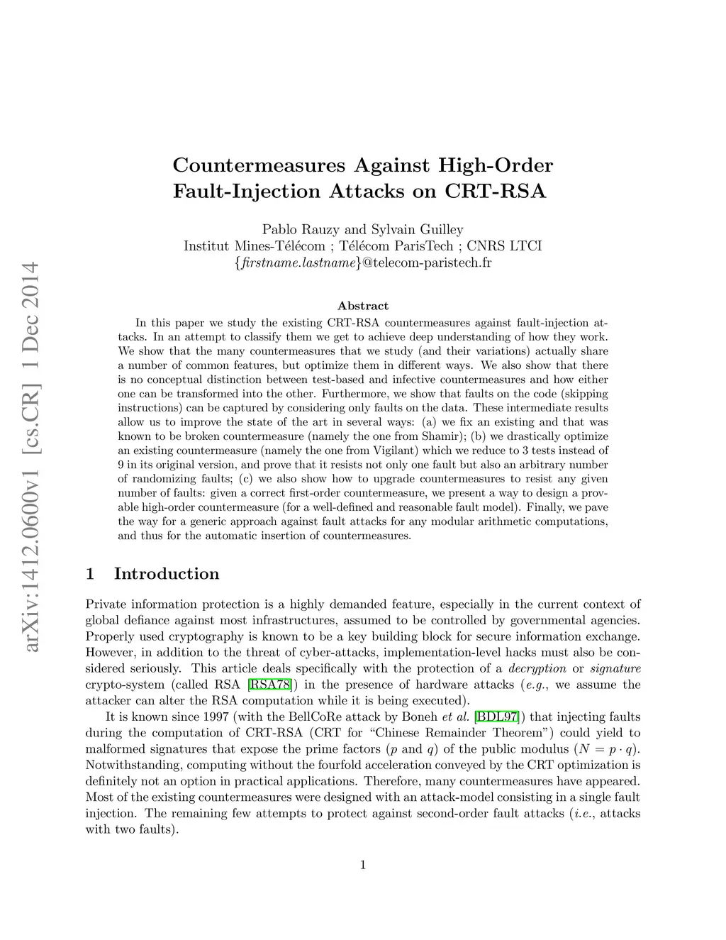 In this paper we study the existing CRT-RSA countermeasures against fault-injection at-tacks. In an attempt to classify them we get to achieve deep understanding of how they work. We show that the many countermeasures that we study (and their variations) actually share a number of common features, but optimize them in different ways. We also show that there is no conceptual distinction between test-based and infective countermeasures and how either one can be transformed into the other. Furthermore, we show that faults on the code (skipping instructions) can be captured by considering only faults on the data. These intermediate results allow us to improve the state of the art in several ways: (a) we fix an existing and that was known to be broken countermeasure (namely the one from Shamir); (b) we drastically optimize an existing countermeasure (namely the one from Vigilant) which we reduce to 3 tests instead of 9 in its original version, and prove that it resists not only one fault but also an arbitrary number of randomizing faults; (c) we also show how to upgrade countermeasures to resist any given number of faults: given a correct first-order countermeasure, we present a way to design a prov-able high-order countermeasure (for a well-defined and reasonable fault model). Finally, we pave the way for a generic approach against fault attacks for any modular arithmetic computations, and thus for the automatic insertion of countermeasures.