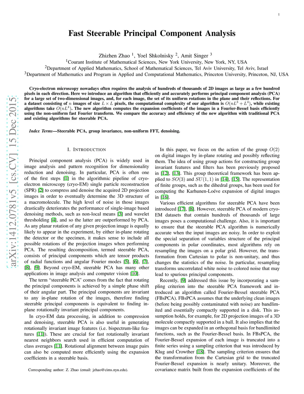 Cryo-electron microscopy nowadays often requires the analysis of hundreds of thousands of 2D images as large as a few hundred pixels in each direction. Here we introduce an algorithm that efficiently and accurately performs principal component analysis (PCA) for a large set of two-dimensional images, and, for each image, the set of its uniform rotations in the plane and their reflections. For a dataset consisting of images of size pixels, the computational complexity of our algorithm is , while existing algorithms take . The new algorithm computes the expansion coefficients of the images in a Fourier-Bessel basis efficiently using the non-uniform fast Fourier transform. We compare the accuracy and efficiency of the new algorithm with traditional PCA and existing algorithms for steerable PCA.