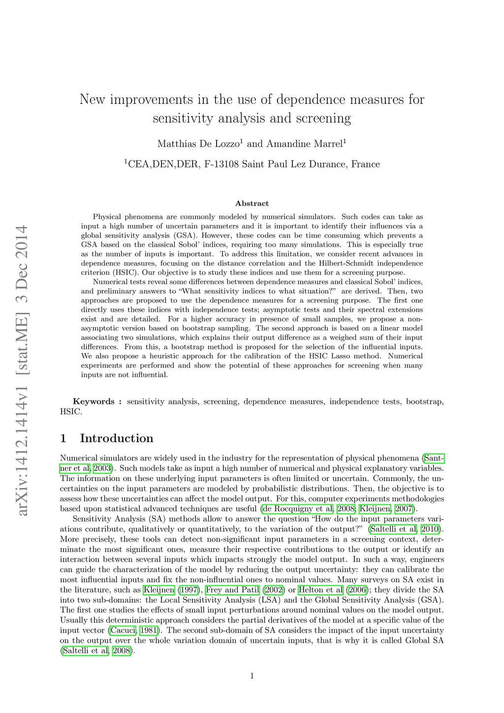 Physical phenomena are commonly modeled by numerical simulators. Such codes can take as input a high number of uncertain parameters and it is important to identify their influences via a global sensitivity analysis (GSA). However, these codes can be time consuming which prevents a GSA based on the classical Sobol' indices, requiring too many simulations. This is especially true as the number of inputs is important. To address this limitation, we consider recent advances in dependence measures, focusing on the distance correlation and the Hilbert-Schmidt independence criterion (HSIC). Our objective is to study these indices and use them for a screening purpose. Numerical tests reveal some differences between dependence measures and classical Sobol' indices, and preliminary answers to "What sensitivity indices to what situation?" are derived. Then, two approaches are proposed to use the dependence measures for a screening purpose. The first one directly uses these indices with independence tests; asymptotic tests and their spectral extensions exist and are detailed. For a higher accuracy in presence of small samples, we propose a non-asymptotic version based on bootstrap sampling. The second approach is based on a linear model associating two simulations, which explains their output difference as a weighed sum of their input differences. From this, a bootstrap method is proposed for the selection of the influential inputs. We also propose a heuristic approach for the calibration of the HSIC Lasso method. Numerical experiments are performed and show the potential of these approaches for screening when many inputs are not influential.