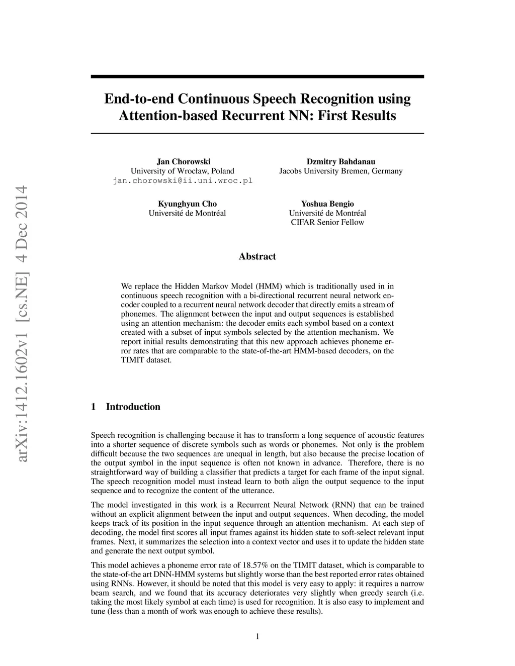 We replace the Hidden Markov Model (HMM) which is traditionally used in in continuous speech recognition with a bi-directional recurrent neural network encoder coupled to a recurrent neural network decoder that directly emits a stream of phonemes. The alignment between the input and output sequences is established using an attention mechanism: the decoder emits each symbol based on a context created with a subset of input symbols elected by the attention mechanism. We report initial results demonstrating that this new approach achieves phoneme error rates that are comparable to the state-of-the-art HMM-based decoders, on the TIMIT dataset.