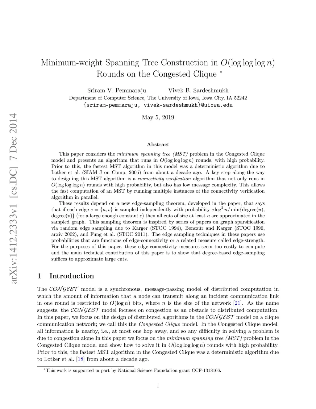 This paper considers the \textit{minimum spanning tree (MST)} problem in the Congested Clique model and presents an algorithm that runs in rounds, with high probability. Prior to this, the fastest MST algorithm in this model was a deterministic algorithm due to Lotker et al.~(SIAM J on Comp, 2005) from about a decade ago. A key step along the way to designing this MST algorithm is a \textit{connectivity verification} algorithm that not only runs in rounds with high probability, but also has low message complexity. This allows the fast computation of an MST by running multiple instances of the connectivity verification algorithm in parallel. These results depend on a new edge-sampling theorem, developed in the paper, that says that if each edge is sampled independently with probability (for a large enough constant ) then all cuts of size at least are approximated in the sampled graph. This sampling theorem is inspired by series of papers on graph sparsification via random edge sampling due to Karger~(STOC 1994), Bencz\úr and Karger~(STOC 1996, arxiv 2002), and Fung et al.~(STOC 2011). The edge sampling techniques in these papers use probabilities that are functions of edge-connectivity or a related measure called edge-strength. For the purposes of this paper, these edge-connectivity measures seem too costly to compute and the main technical contribution of this paper is to show that degree-based edge-sampling suffices to approximate large cuts.