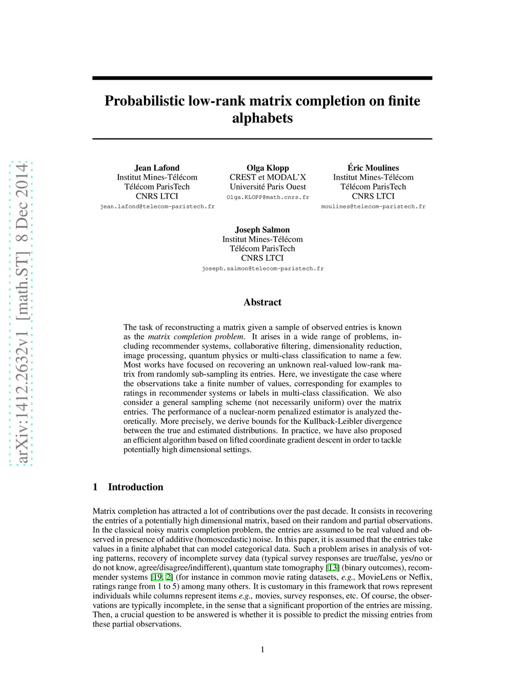 The task of reconstructing a matrix given a sample of observedentries is known as the matrix completion problem. It arises ina wide range of problems, including recommender systems, collaborativefiltering, dimensionality reduction, image processing, quantum physics or multi-class classificationto name a few. Most works have focused on recovering an unknown real-valued low-rankmatrix from randomly sub-sampling its entries.Here, we investigate the case where the observations take a finite number of values, corresponding for examples to ratings in recommender systems or labels in multi-class classification.We also consider a general sampling scheme (not necessarily uniform) over the matrix entries.The performance of a nuclear-norm penalized estimator is analyzed theoretically.More precisely, we derive bounds for the Kullback-Leibler divergence between the true and estimated distributions.In practice, we have also proposed an efficient algorithm based on lifted coordinate gradient descent in order to tacklepotentially high dimensional settings.