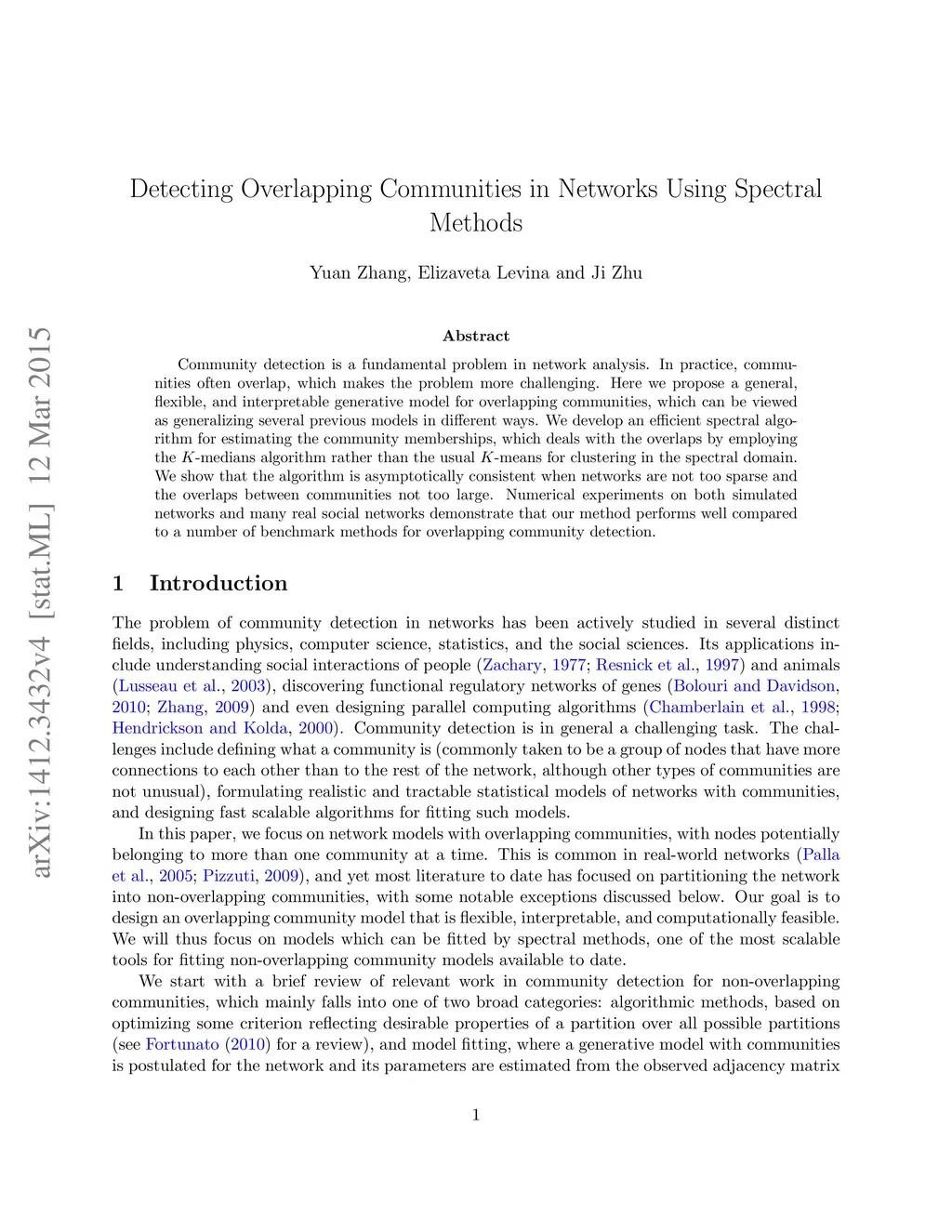 Community detection is a fundamental problem in network analysis which is made more challenging by overlaps between communities which often occur in practice. Here we propose a general, flexible, and interpretable generative model for overlapping communities, which can be thought of as a generalization of the degree-corrected stochastic block model. We develop an efficient spectral algorithm for estimating the community memberships, which deals with the overlaps by employing the K-medians algorithm rather than the usual K-means for clustering in the spectral domain. We show that the algorithm is asymptotically consistent when networks are not too sparse and the overlaps between communities not too large. Numerical experiments on both simulated networks and many real social networks demonstrate that our method performs very well compared to a number of benchmark methods for overlapping community detection.