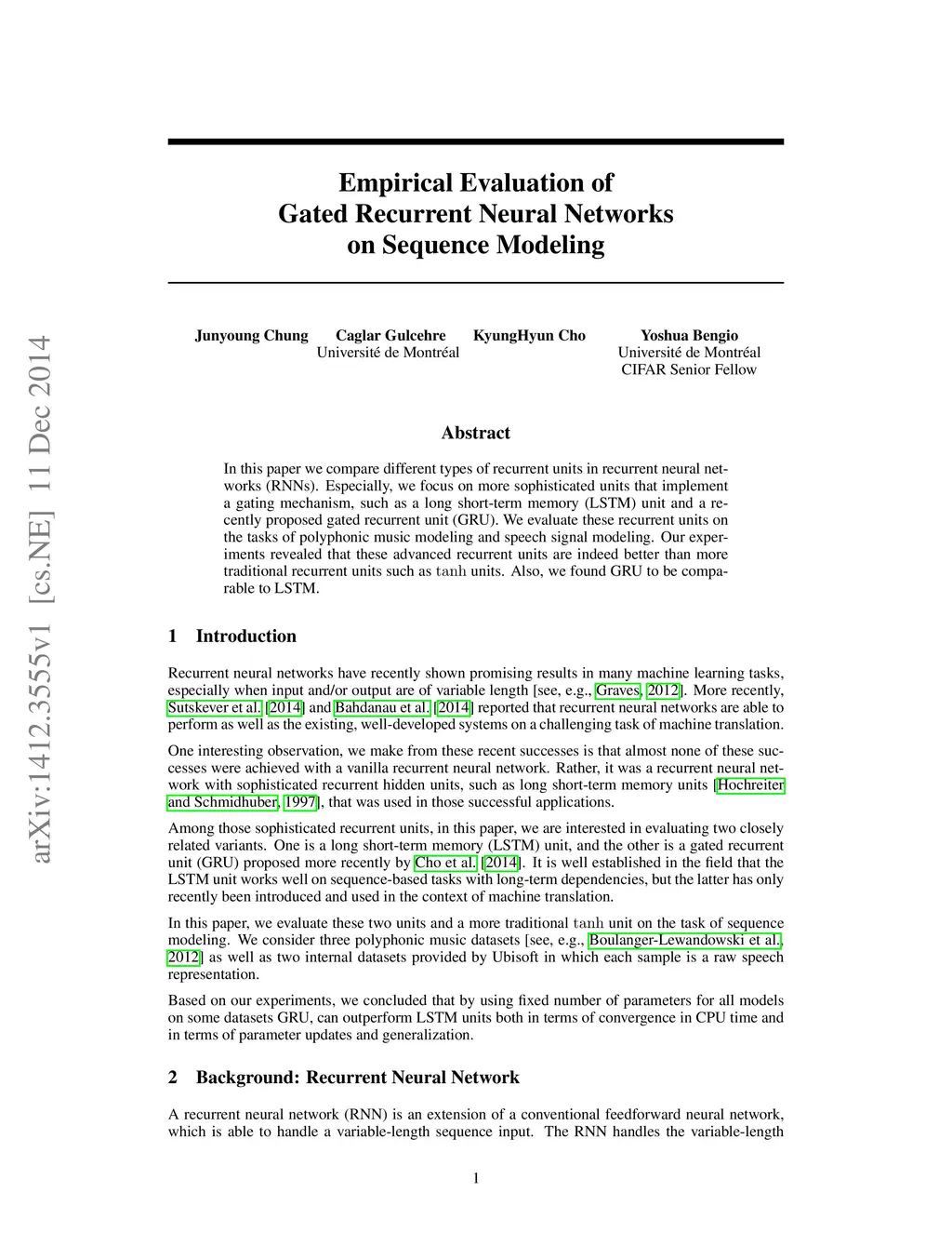 In this paper we compare different types of recurrent units in recurrent neural networks (RNNs). Especially, we focus on more sophisticated units that implement a gating mechanism, such as a long short-term memory (LSTM) unit and a recently proposed gated recurrent unit (GRU). We evaluate these recurrent units on the tasks of polyphonic music modeling and speech signal modeling. Our experiments revealed that these advanced recurrent units are indeed better than more traditional recurrent units such as tanh units. Also, we found GRU to be comparable to LSTM.