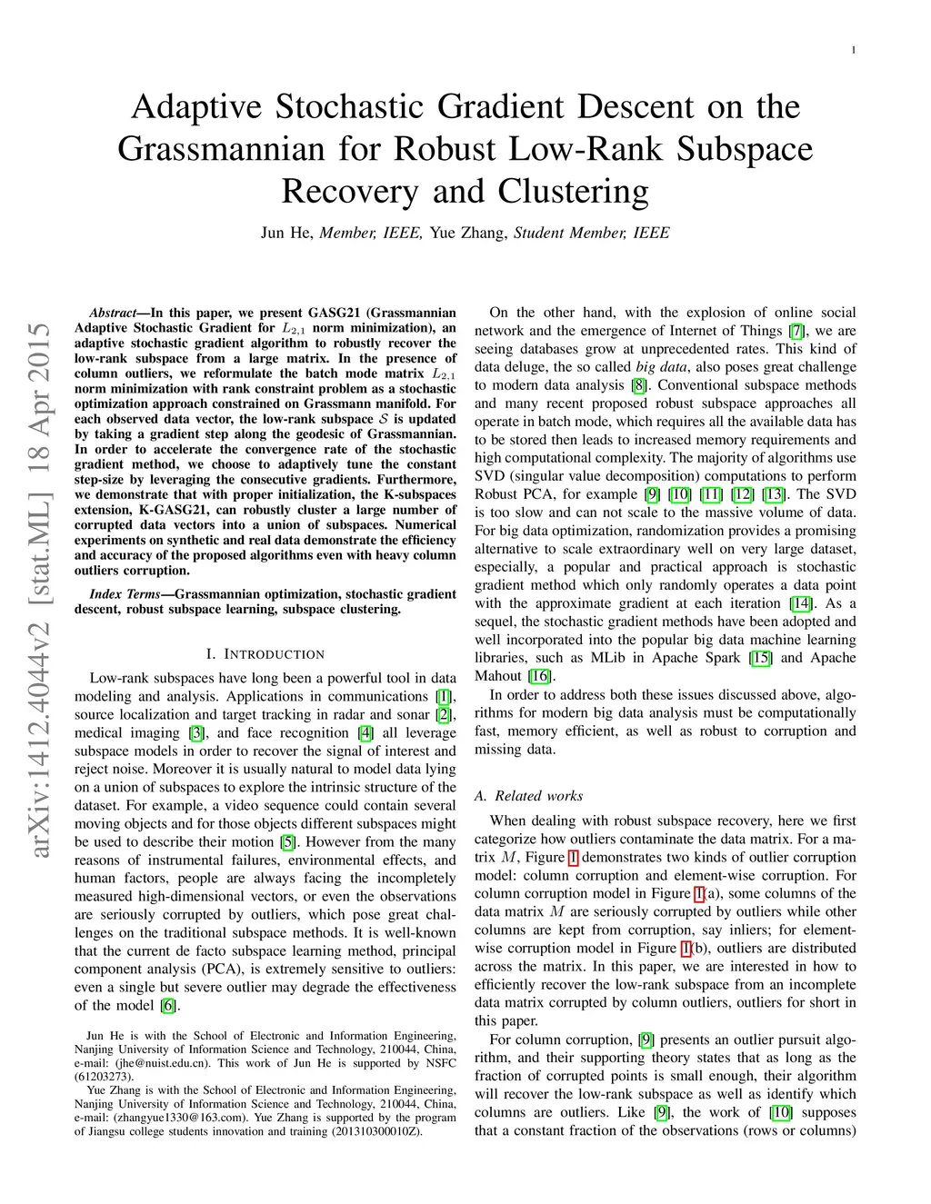 In this paper, we present GASG21 (Grassmannian Adaptive Stochastic Gradient for norm minimization), an adaptive stochastic gradient algorithm to robustly recover the low-rank subspace from a large matrix. In the presence of column outliers, we reformulate the batch mode matrix norm minimization with rank constraint problem as a stochastic optimization approach constrained on Grassmann manifold. For each observed data vector, the low-rank subspace is updated by taking a gradient step along the geodesic of Grassmannian. In order to accelerate the convergence rate of the stochastic gradient method, we choose to adaptively tune the constant step-size by leveraging the consecutive gradients. Furthermore, we demonstrate that with proper initialization, the K-subspaces extension, K-GASG21, can robustly cluster a large number of corrupted data vectors into a union of subspaces. Numerical experiments on synthetic and real data demonstrate the efficiency and accuracy of the proposed algorithms even with heavy column outliers corruption.