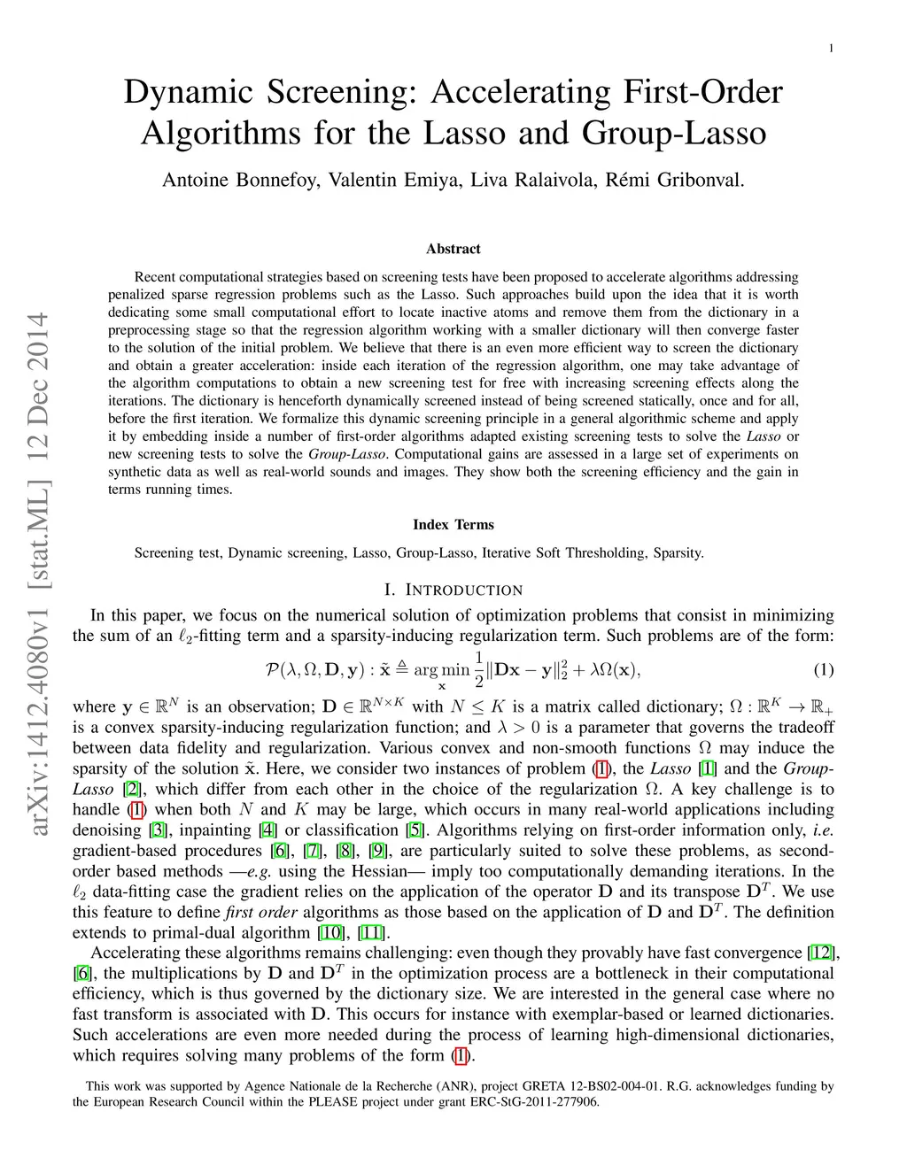 Recent computational strategies based on screening tests have been proposed to accelerate algorithms addressing penalized sparse regression problems such as the Lasso. Such approaches build upon the idea that it is worth dedicating some small computational effort to locate inactive atoms and remove them from the dictionary in a preprocessing stage so that the regression algorithm working with a smaller dictionary will then converge faster to the solution of the initial problem. We believe that there is an even more efficient way to screen the dictionary and obtain a greater acceleration: inside each iteration of the regression algorithm, one may take advantage of the algorithm computations to obtain a new screening test for free with increasing screening effects along the iterations. The dictionary is henceforth dynamically screened instead of being screened statically, once and for all, before the first iteration. We formalize this dynamic screening principle in a general algorithmic scheme and apply it by embedding inside a number of first-order algorithms adapted existing screening tests to solve the Lasso or new screening tests to solve the Group-Lasso. Computational gains are assessed in a large set of experiments on synthetic data as well as real-world sounds and images. They show both the screening efficiency and the gain in terms running times.
