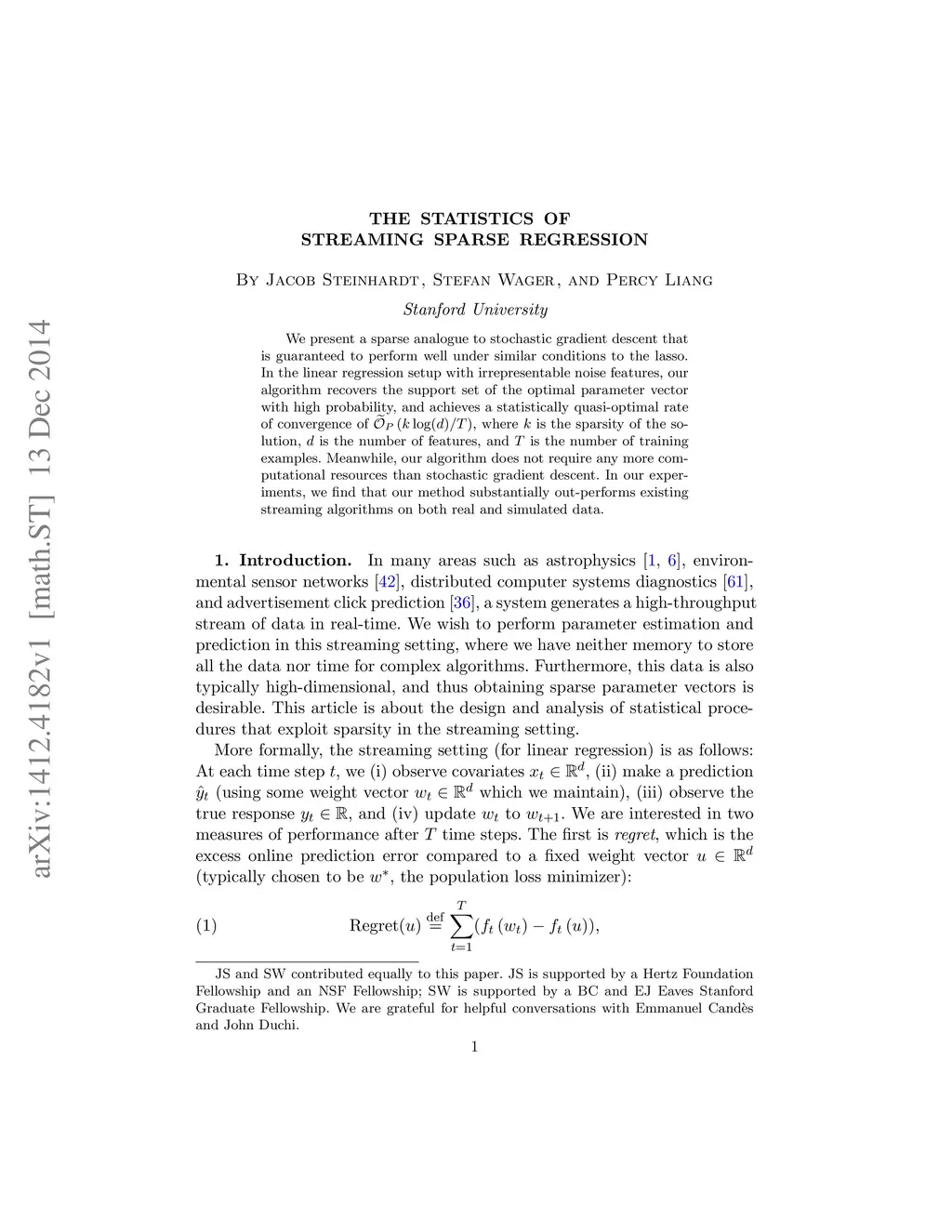 We present a sparse analogue to stochastic gradient descent that is guaranteed to perform well under similar conditions to the lasso. In the linear regression setup with irrepresentable noise features, our algorithm recovers the support set of the optimal parameter vector with high probability, and achieves a statistically quasi-optimal rate of convergence of Op(k log(d)/T), where k is the sparsity of the solution, d is the number of features, and T is the number of training examples. Meanwhile, our algorithm does not require any more computational resources than stochastic gradient descent. In our experiments, we find that our method substantially out-performs existing streaming algorithms on both real and simulated data.