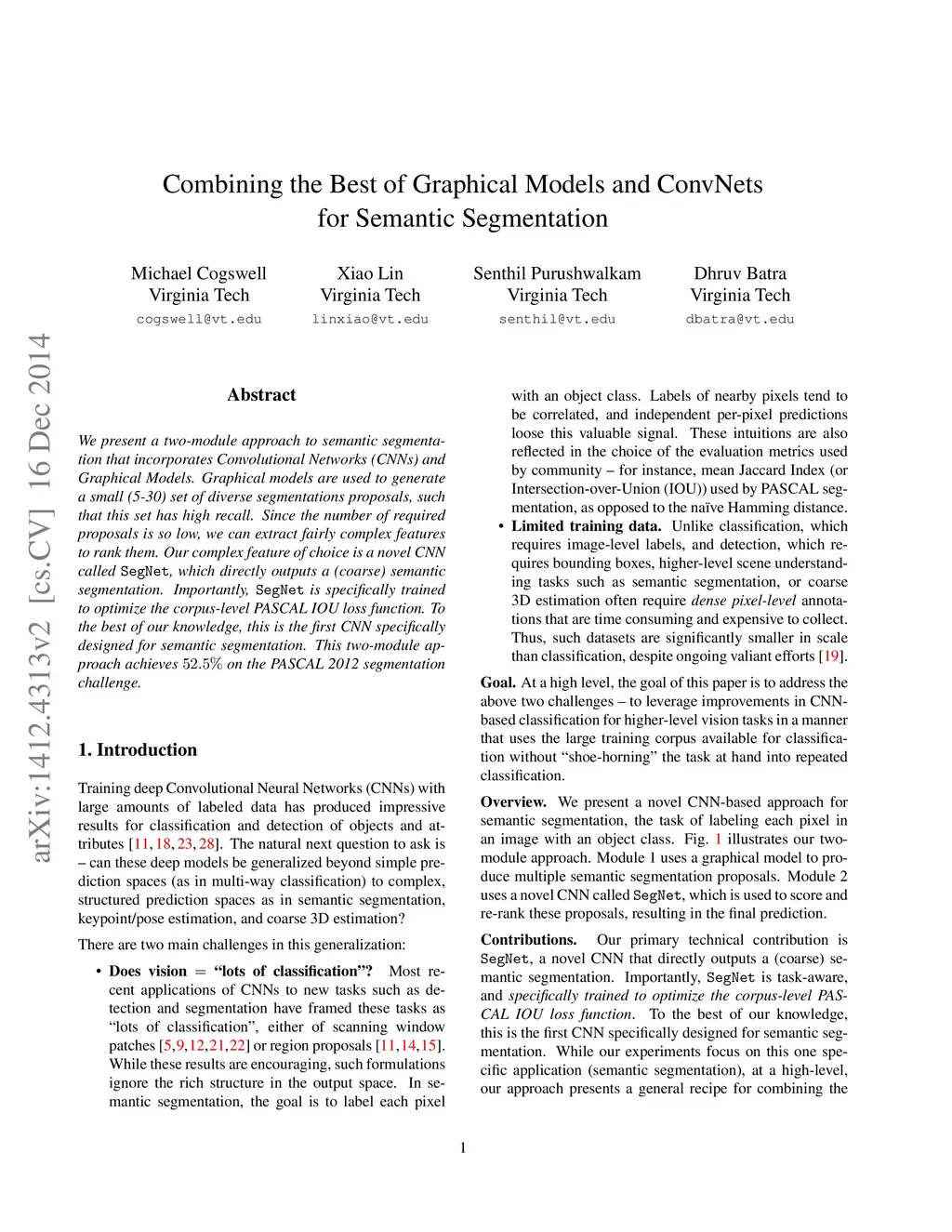 We present a two-module approach to semantic segmentation that incorporates Convolutional Networks (CNNs) and Graphical Models. Graphical models are used to generate a small (5-30) set of diverse segmentations proposals, such that this set has high recall. Since the number of required proposals is so low, we can extract fairly complex features to rank them. Our complex feature of choice is a novel CNN called SegNet, which directly outputs a (coarse) semantic segmentation. Importantly, SegNet is specifically trained to optimize the corpus-level PASCAL IOU loss function. To the best of our knowledge, this is the first CNN specifically designed for semantic segmentation. This two-module approach achieves on the PASCAL 2012 segmentation challenge.