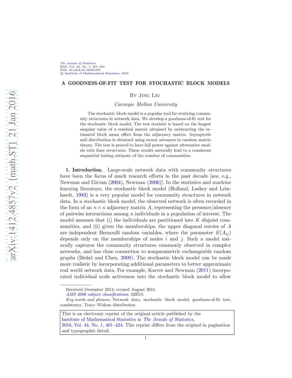 The stochastic block model is a popular tool for studying community structures in network data. We develop a goodness-of-fit test for the stochastic block model. The test statistic is based on the largest singular value of a residual matrix obtained by subtracting the estimated block mean effect from the adjacency matrix. Asymptotic null distribution is obtained using recent advances in random matrix theory. The test is proved to have full power against alternative models with finer structures. These results naturally lead to a consistent sequential testing estimate of the number of communities.