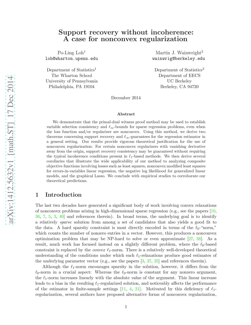 We demonstrate that the primal-dual witness proof method may be used to establish variable selection consistency and -bounds for sparse regression problems, even when the loss function and/or regularizer are nonconvex. Using this method, we derive two theorems concerning support recovery and -guarantees for the regression estimator in a general setting. Our results provide rigorous theoretical justification for the use of nonconvex regularization: For certain nonconvex regularizers with vanishing derivative away from the origin, support recovery consistency may be guaranteed without requiring the typical incoherence conditions present in -based methods. We then derive several corollaries that illustrate the wide applicability of our method to analyzing composite objective functions involving losses such as least squares, nonconvex modified least squares for errors-in variables linear regression, the negative log likelihood for generalized linear models, and the graphical Lasso. We conclude with empirical studies to corroborate our theoretical predictions.