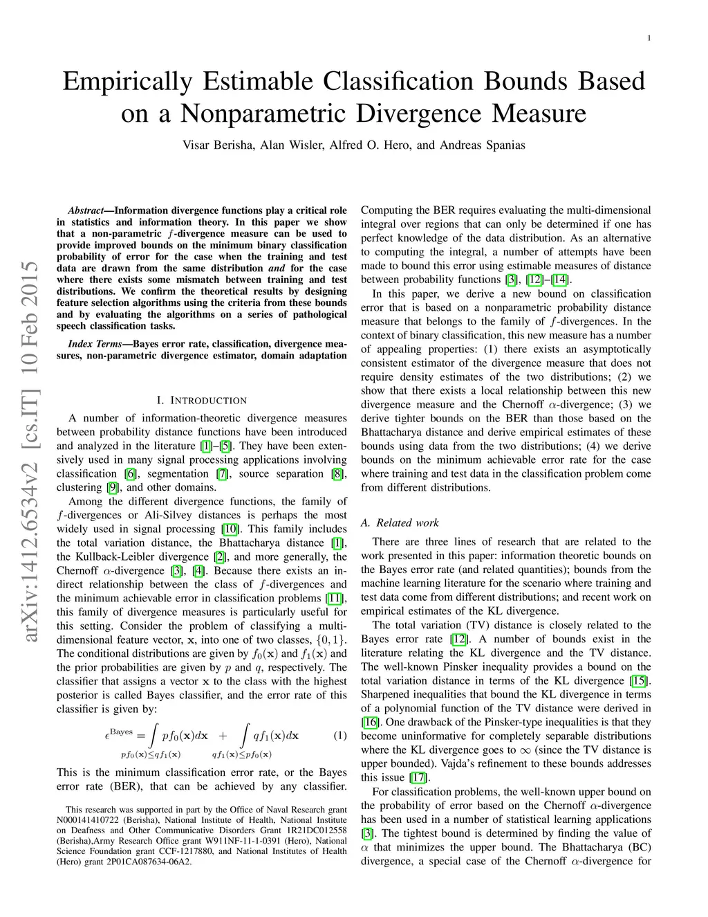 Information divergence functions play a critical role in statistics and information theory. In this paper we show that a non-parametric f-divergence measure can be used to provide improved bounds on the minimum binary classification probability of error for the case when the training and test data are drawn from the same distribution and for the case where there exists some mismatch between training and test distributions. We confirm the theoretical results by designing feature selection algorithms using the criteria from these bounds and by evaluating the algorithms on a series of pathological speech classification tasks.