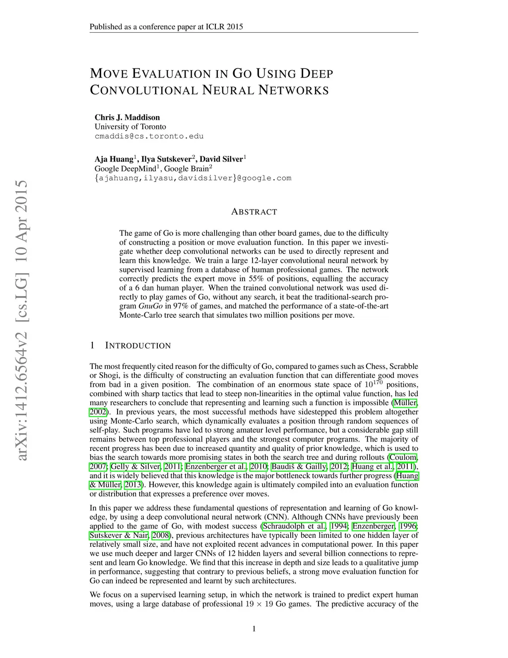 The game of Go is more challenging than other board games, due to the difficulty of constructing a position or move evaluation function. In this paper we investigate whether deep convolutional networks can be used to directly represent and learn this knowledge. We train a large 12-layer convolutional neural network by supervised learning from a database of human professional games. The network correctly predicts the expert move in 55% of positions, equalling the accuracy of a 6 dan human player. When the trained convolutional network was used directly to play games of Go, without any search, it beat the traditional search program GnuGo in 97% of games, and matched the performance of a state-of-the-art Monte-Carlo tree search that simulates a million positions per move.