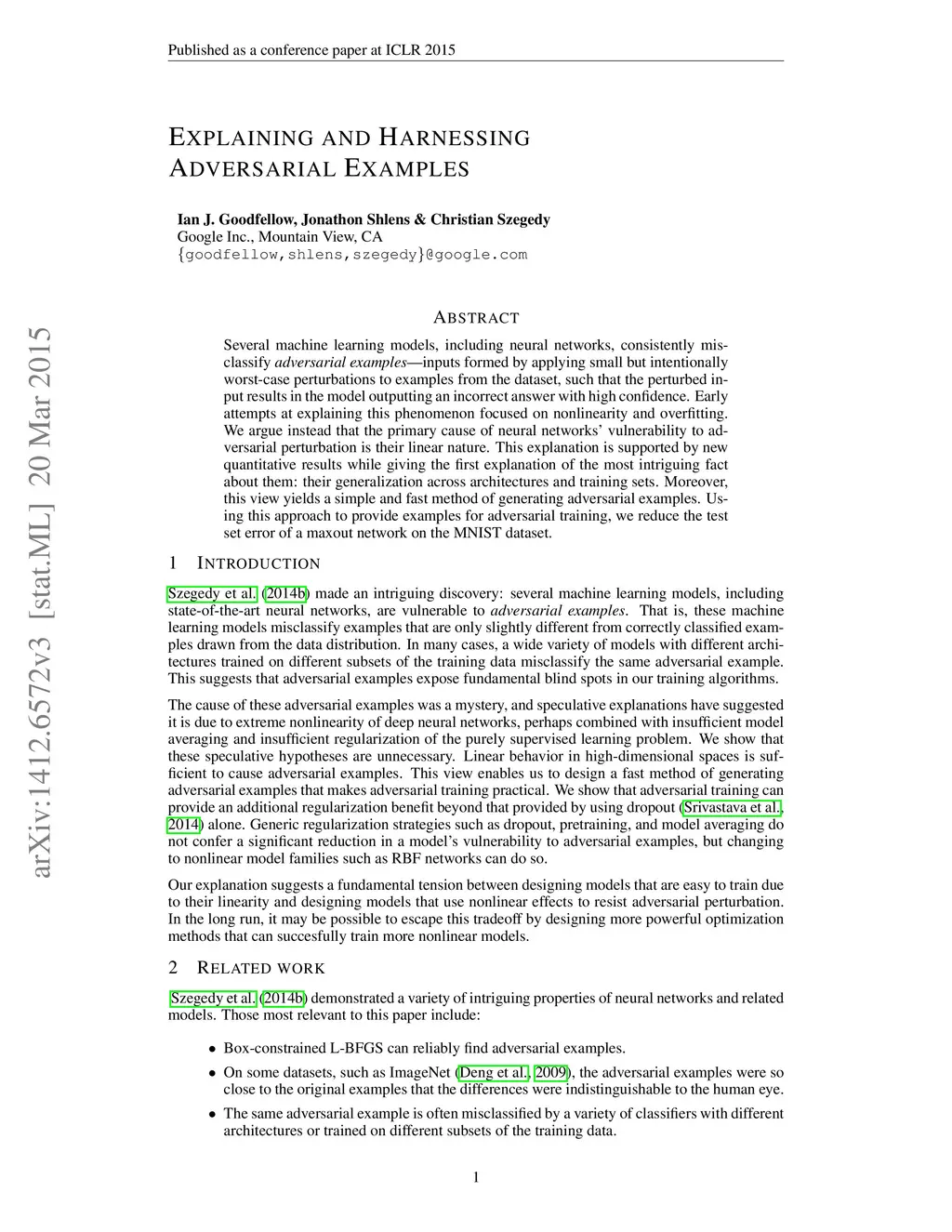 Several machine learning models, including neural networks, consistently misclassify adversarial examples---inputs formed by applying small but intentionally worst-case perturbations to examples from the dataset, such that the perturbed input results in the model outputting an incorrect answer with high confidence. Early attempts at explaining this phenomenon focused on nonlinearity and overfitting. We argue instead that the primary cause of neural networks' vulnerability to adversarial perturbation is their linear nature. This explanation is supported by new quantitative results while giving the first explanation of the most intriguing fact about them: their generalization across architectures and training sets. Moreover, this view yields a simple and fast method of generating adversarial examples. Using this approach to provide examples for adversarial training, we reduce the test set error of a maxout network on the MNIST dataset.