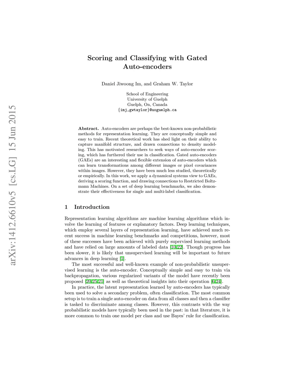Auto-encoders are perhaps the best-known non-probabilistic methods for representation learning. They are conceptually simple and easy to train. Recent theoretical work has shed light on their ability to capture manifold structure, and drawn connections to density modelling. This has motivated researchers to seek ways of auto-encoder scoring, which has furthered their use in classification. Gated auto-encoders (GAEs) are an interesting and flexible extension of auto-encoders which can learn transformations among different images or pixel covariances within images. However, they have been much less studied, theoretically or empirically. In this work, we apply a dynamical systems view to GAEs, deriving a scoring function, and drawing connections to Restricted Boltzmann Machines. On a set of deep learning benchmarks, we also demonstrate their effectiveness for single and multi-label classification.