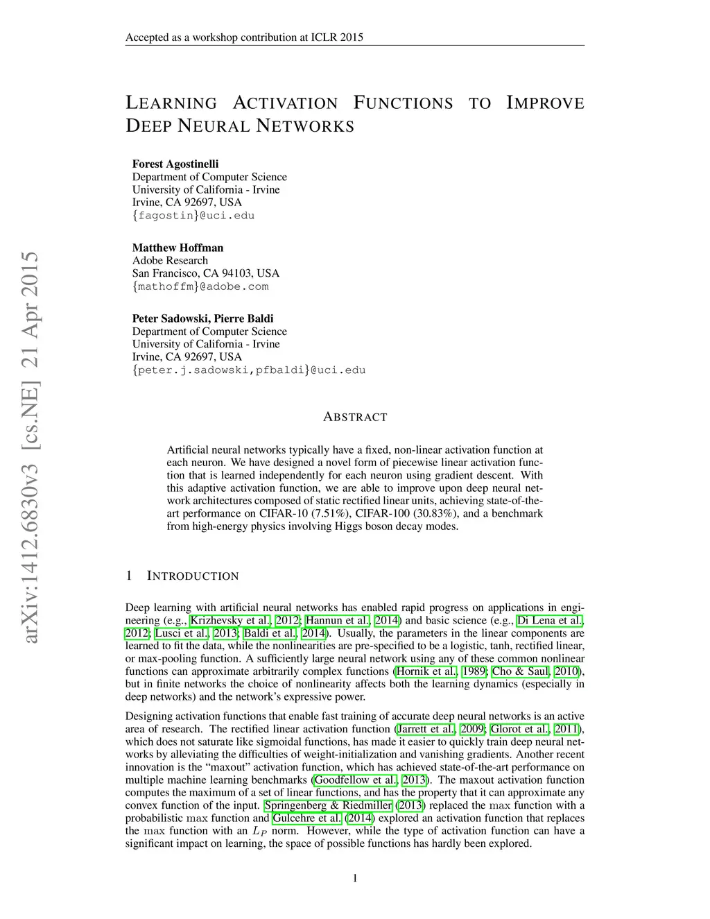 Artificial neural networks typically have a fixed, non-linear activation function at each neuron. We have designed a novel form of piecewise linear activation function that is learned independently for each neuron using gradient descent. With this adaptive activation function, we are able to improve upon deep neural network architectures composed of static rectified linear units, achieving state-of-the-art performance on CIFAR-10 (7.51%), CIFAR-100 (30.83%), and a benchmark from high-energy physics involving Higgs boson decay modes.