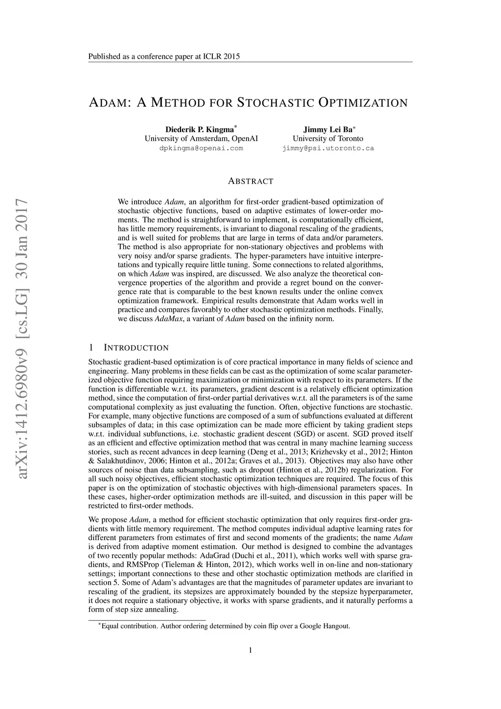 We introduce Adam, an algorithm for first-order gradient-based optimization of stochastic objective functions, based on adaptive estimates of lower-order moments. The method is straightforward to implement, is computationally efficient, has little memory requirements, is invariant to diagonal rescaling of the gradients, and is well suited for problems that are large in terms of data and/or parameters. The method is also appropriate for non-stationary objectives and problems with very noisy and/or sparse gradients. The hyper-parameters have intuitive interpretations and typically require little tuning. Some connections to related algorithms, on which Adam was inspired, are discussed. We also analyze the theoretical convergence properties of the algorithm and provide a regret bound on the convergence rate that is comparable to the best known results under the online convex optimization framework. Empirical results demonstrate that Adam works well in practice and compares favorably to other stochastic optimization methods. Finally, we discuss AdaMax, a variant of Adam based on the infinity norm.