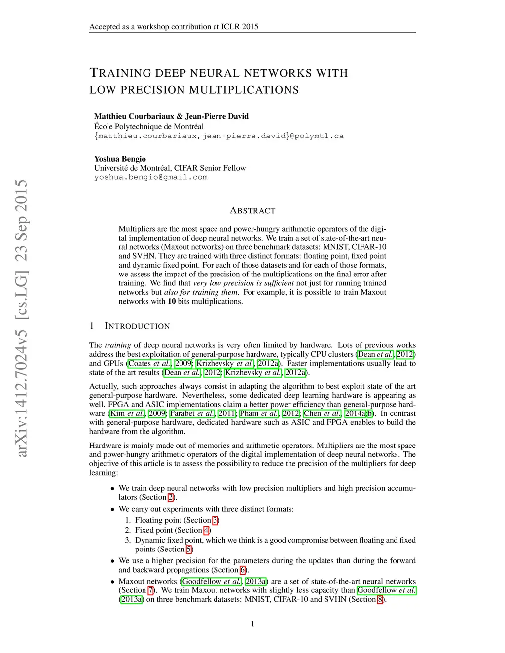 Multipliers are the most space and power-hungry arithmetic operators of the digital implementation of deep neural networks. We train a set of state-of-the-art neural networks (Maxout networks) on three benchmark datasets: MNIST, CIFAR-10 and SVHN. They are trained with three distinct formats: floating point, fixed point and dynamic fixed point. For each of those datasets and for each of those formats, we assess the impact of the precision of the multiplications on the final error after training. We find that very low precision is sufficient not just for running trained networks but also for training them. For example, it is possible to train Maxout networks with 10 bits multiplications.