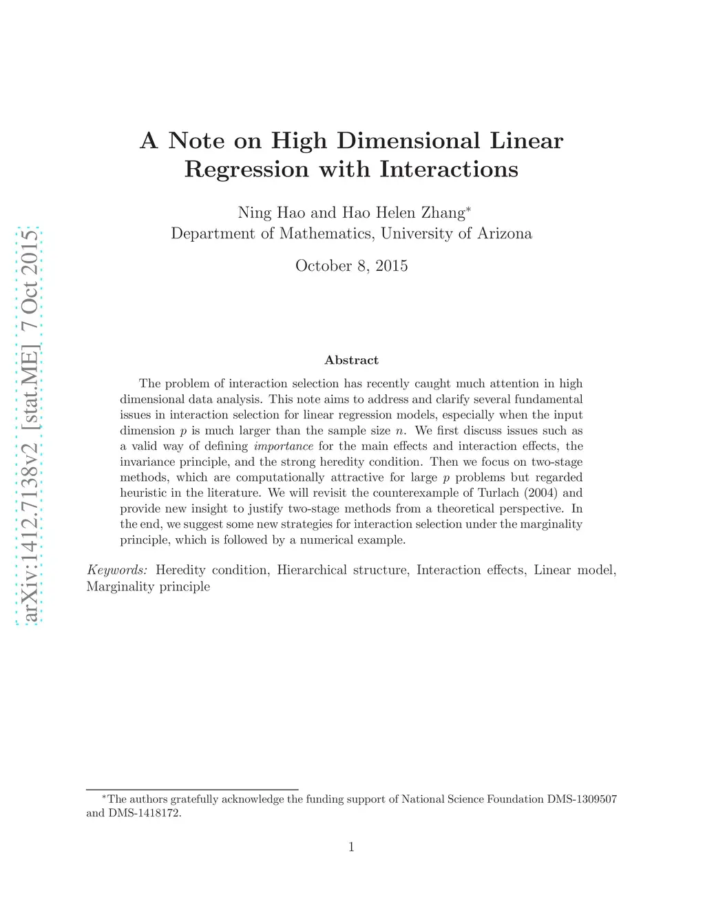 A Note on High Dimensional Linear Regression with Interactions