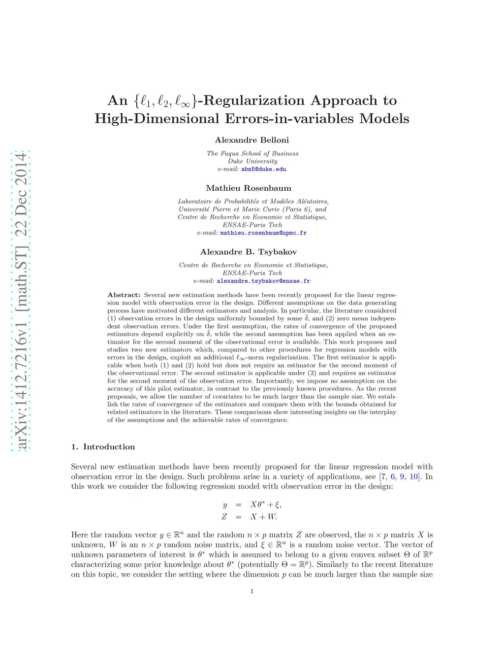 Several new estimation methods have been recently proposed for the linear regression model with observation error in the design. Different assumptions on the data generating process have motivated different estimators and analysis. In particular, the literature considered (1) observation errors in the design uniformly bounded by some , and (2) zero mean independent observation errors. Under the first assumption, the rates of convergence of the proposed estimators depend explicitly on , while the second assumption has been applied when an estimator for the second moment of the observational error is available. This work proposes and studies two new estimators which, compared to other procedures for regression models with errors in the design, exploit an additional -norm regularization. The first estimator is applicable when both (1) and (2) hold but does not require an estimator for the second moment of the observational error. The second estimator is applicable under (2) and requires an estimator for the second moment of the observation error. Importantly, we impose no assumption on the accuracy of this pilot estimator, in contrast to the previously known procedures. As the recent proposals, we allow the number of covariates to be much larger than the sample size. We establish the rates of convergence of the estimators and compare them with the bounds obtained for related estimators in the literature. These comparisons show interesting insights on the interplay of the assumptions and the achievable rates of convergence.