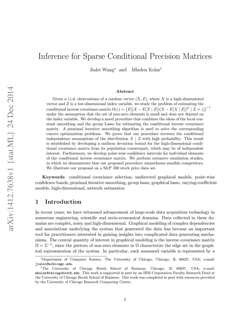 Given i.i.d. observations of a random vector , where is a high-dimensional vector and is a low-dimensional index variable, we study the problem of estimating the conditional inverse covariance matrix under the assumption that the set of non-zero elements is small and does not depend on the index variable. We develop a novel procedure that combines the ideas of the local constant smoothing and the group Lasso for estimating the conditional inverse covariance matrix. A proximal iterative smoothing algorithm is used to solve the corresponding convex optimization problems. We prove that our procedure recovers the conditional independence assumptions of the distribution with high probability. This result is established by developing a uniform deviation bound for the high-dimensional conditional covariance matrix from its population counterpart, which may be of independent interest. Furthermore, we develop point-wise confidence intervals for individual elements of the conditional inverse covariance matrix. We perform extensive simulation studies, in which we demonstrate that our proposed procedure outperforms sensible competitors. We illustrate our proposal on a S&P 500 stock price data set.