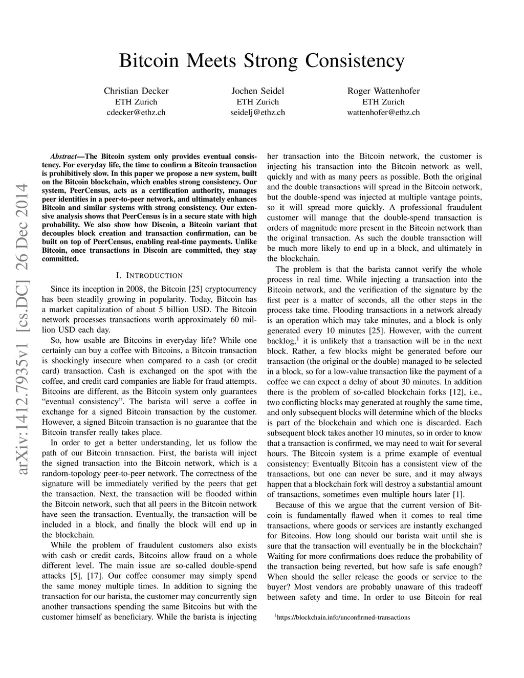 The Bitcoin system only provides eventual consistency. For everyday life, the time to confirm a Bitcoin transaction is prohibitively slow. In this paper we propose a new system, built on the Bitcoin blockchain, which enables strong consistency. Our system, PeerCensus, acts as a certification authority, manages peer identities in a peer-to-peer network, and ultimately enhances Bitcoin and similar systems with strong consistency. Our extensive analysis shows that PeerCensus is in a secure state with high probability. We also show how Discoin, a Bitcoin variant that decouples block creation and transaction confirmation, can be built on top of PeerCensus, enabling real-time payments. Unlike Bitcoin, once transactions in Discoin are committed, they stay committed.