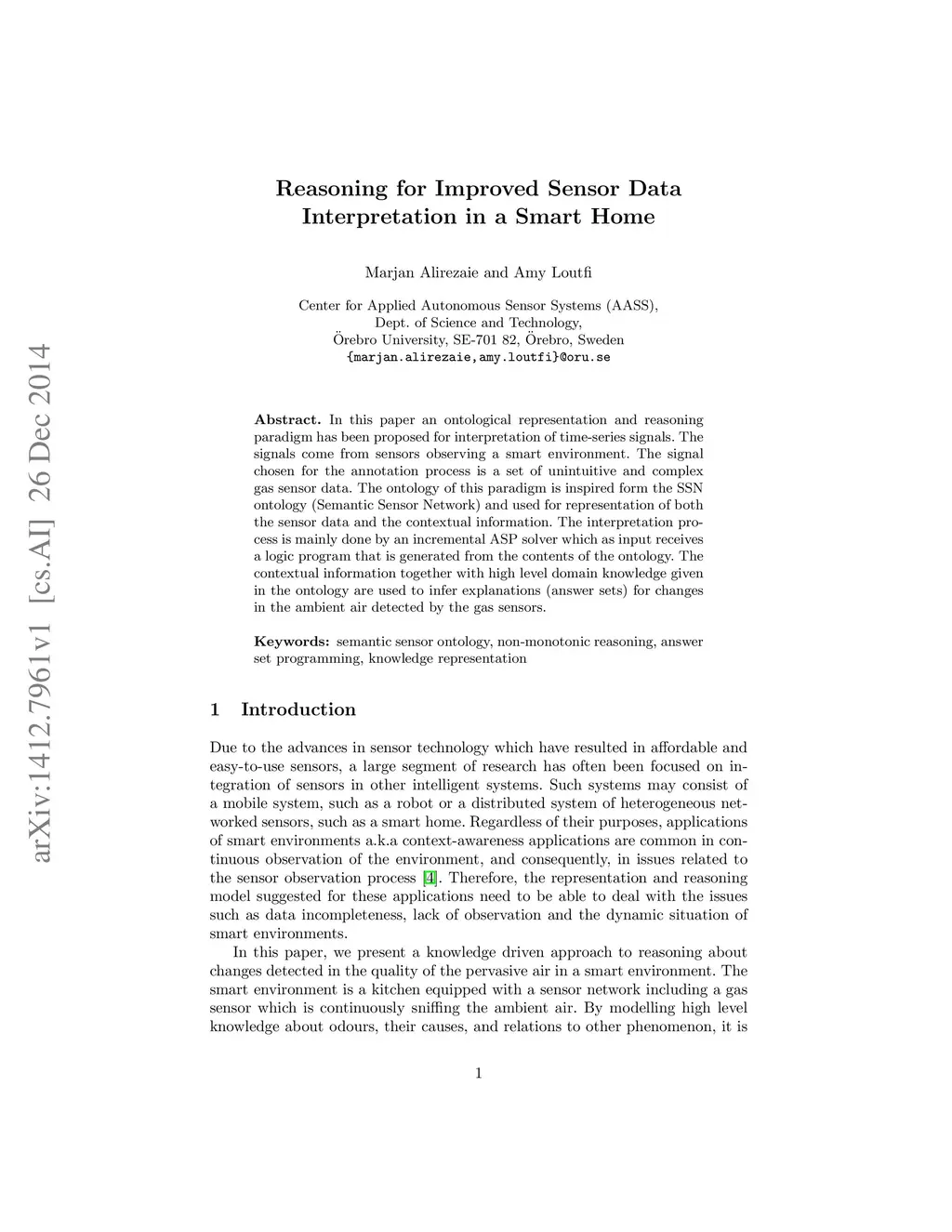 In this paper an ontological representation and reasoning paradigm has been proposed for interpretation of time-series signals. The signals come from sensors observing a smart environment. The signal chosen for the annotation process is a set of unintuitive and complex gas sensor data. The ontology of this paradigm is inspired form the SSN ontology (Semantic Sensor Network) and used for representation of both the sensor data and the contextual information. The interpretation process is mainly done by an incremental ASP solver which as input receives a logic program that is generated from the contents of the ontology. The contextual information together with high level domain knowledge given in the ontology are used to infer explanations (answer sets) for changes in the ambient air detected by the gas sensors.