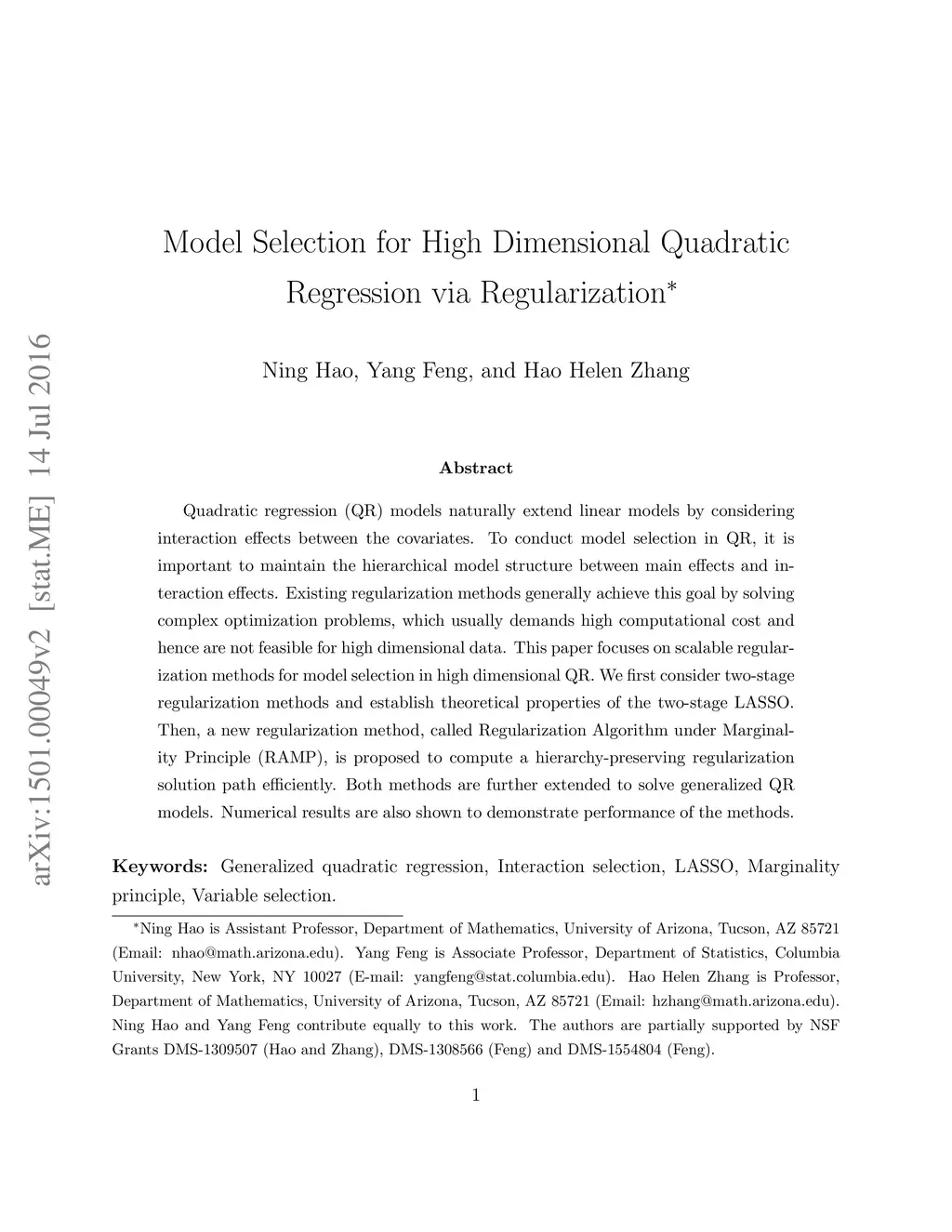 Quadratic regression (QR) models naturally extend linear models by considering interaction effects between the covariates. To conduct model selection in QR, it is important to maintain the hierarchical model structure between main effects and interaction effects. Existing regularization methods generally achieve this goal by solving complex optimization problems, which usually demands high computational cost and hence are not feasible for high dimensional data. This paper focuses on scalable regularization methods for model selection in high dimensional QR. We first consider two-stage regularization methods and establish theoretical properties of the two-stage LASSO. Then, a new regularization method, called Regularization Algorithm under Marginality Principle (RAMP), is proposed to compute a hierarchy-preserving regularization solution path efficiently. Both methods are further extended to solve generalized QR models. Numerical results are also shown to demonstrate performance of the methods.