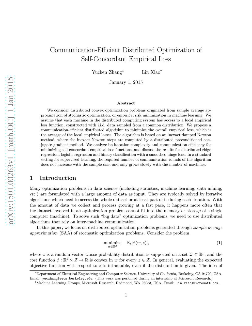 We consider distributed convex optimization problems originated from sample average approximation of stochastic optimization, or empirical risk minimization in machine learning. We assume that each machine in the distributed computing system has access to a local empirical loss function, constructed with i.i.d. data sampled from a common distribution. We propose a communication-efficient distributed algorithm to minimize the overall empirical loss, which is the average of the local empirical losses. The algorithm is based on an inexact damped Newton method, where the inexact Newton steps are computed by a distributed preconditioned conjugate gradient method. We analyze its iteration complexity and communication efficiency for minimizing self-concordant empirical loss functions, and discuss the results for distributed ridge regression, logistic regression and binary classification with a smoothed hinge loss. In a standard setting for supervised learning, the required number of communication rounds of the algorithm does not increase with the sample size, and only grows slowly with the number of machines.