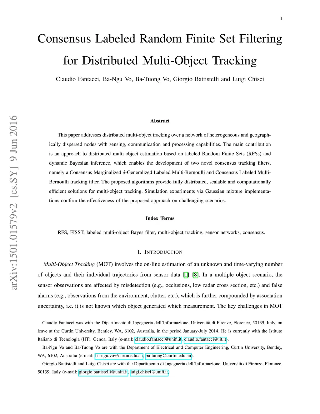 The paper addresses distributed multi-object tracking over a network of heterogeneous and geographically dispersed nodes with sensing, communication and processing capabilities. The main contribution is an information-theoretic approach to distributed estimation based on labeled Random Finite Sets (RFSs) and dynamic Bayesian inference, which enables the development of two novel consensus tracking filters, namely a Consensus Marginalized -Generalized Labeled Multi-Bernoulli (CMGLMB) and consensus Labeled Multi-Bernoulli (CLMB) tracking filter. The proposed algorithms provide fully distributed, scalable and computationally efficient solutions for multi-object tracking. Simulation experiments via Gaussian mixture implementations confirm the effectiveness of the proposed approach on challenging scenarios.