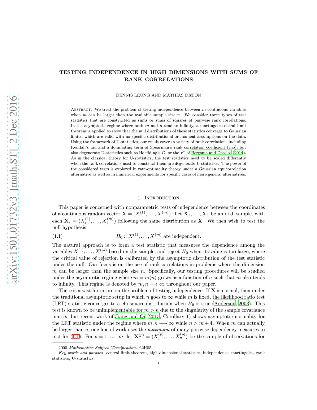 We treat the problem of testing independence between m continuous variables when m can be larger than the available sample size n. We consider three types of test statistics that are constructed as sums or sums of squares of pairwise rank correlations. In the asymptotic regime where both m and n tend to infinity, a martingale central limit theorem is applied to show that the null distributions of these statistics converge to Gaussian limits, which are valid with no specific distributional or moment assumptions on the data. Using the framework of U-statistics, our result covers a variety of rank correlations including Kendall's tau and a dominating term of Spearman's rank correlation coefficient (rho), but also degenerate U-statistics such as Hoeffding's , or the of Bergsma and Dassios (2014). As in the classical theory for U-statistics, the test statistics need to be scaled differently when the rank correlations used to construct them are degenerate U-statistics. The power of the considered tests is explored in rate-optimality theory under Gaussian equicorrelation alternatives as well as in numerical experiments for specific cases of more general alternatives.