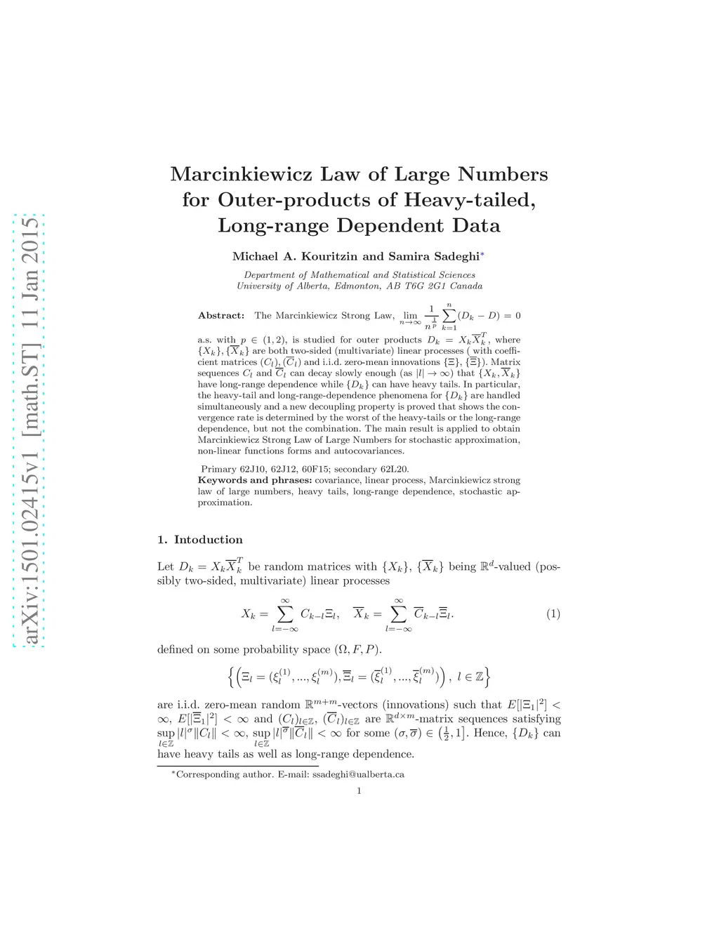 The Marcinkiewicz Strong Law, a.s. with , is studied for outer products , where are both two-sided (multivariate) linear processes ( with coefficient matrices and i.i.d.\ zero-mean innovations , ). Matrix sequences and can decay slowly enough (as ) that have long-range dependence while can have heavy tails. In particular, the heavy-tail and long-range-dependence phenomena for are handled simultaneously and a new decoupling property is proved that shows the convergence rate is determined by the worst of the heavy-tails or the long-range dependence, but not the combination. The main result is applied to obtain Marcinkiewicz Strong Law of Large Numbers for stochastic approximation, non-linear functions forms and autocovariances.