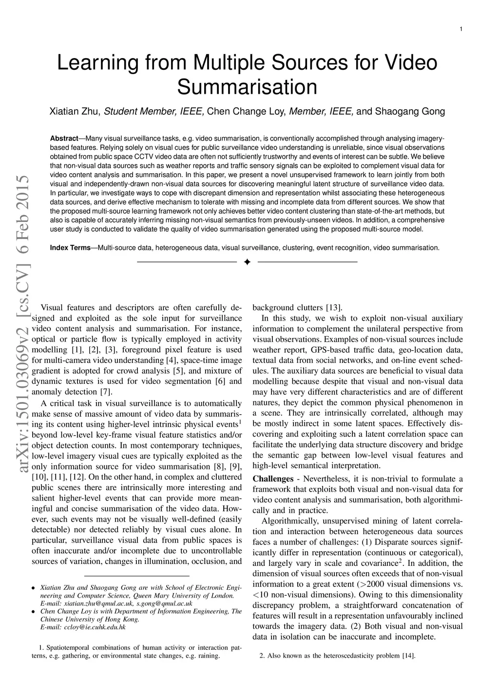 Many visual surveillance tasks, e.g.video summarisation, is conventionally accomplished through analysing imagerybased features. Relying solely on visual cues for public surveillance video understanding is unreliable, since visual observations obtained from public space CCTV video data are often not sufficiently trustworthy and events of interest can be subtle. On the other hand, non-visual data sources such as weather reports and traffic sensory signals are readily accessible but are not explored jointly to complement visual data for video content analysis and summarisation. In this paper, we present a novel unsupervised framework to learn jointly from both visual and independently-drawn non-visual data sources for discovering meaningful latent structure of surveillance video data. In particular, we investigate ways to cope with discrepant dimension and representation whist associating these heterogeneous data sources, and derive effective mechanism to tolerate with missing and incomplete data from different sources. We show that the proposed multi-source learning framework not only achieves better video content clustering than state-of-the-art methods, but also is capable of accurately inferring missing non-visual semantics from previously unseen videos. In addition, a comprehensive user study is conducted to validate the quality of video summarisation generated using the proposed multi-source model.